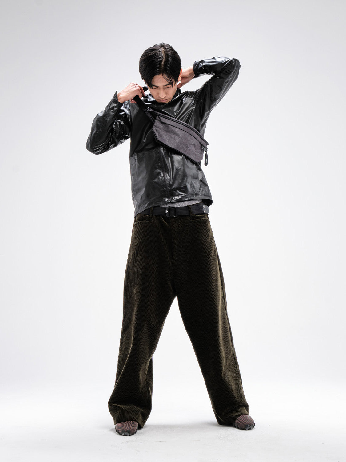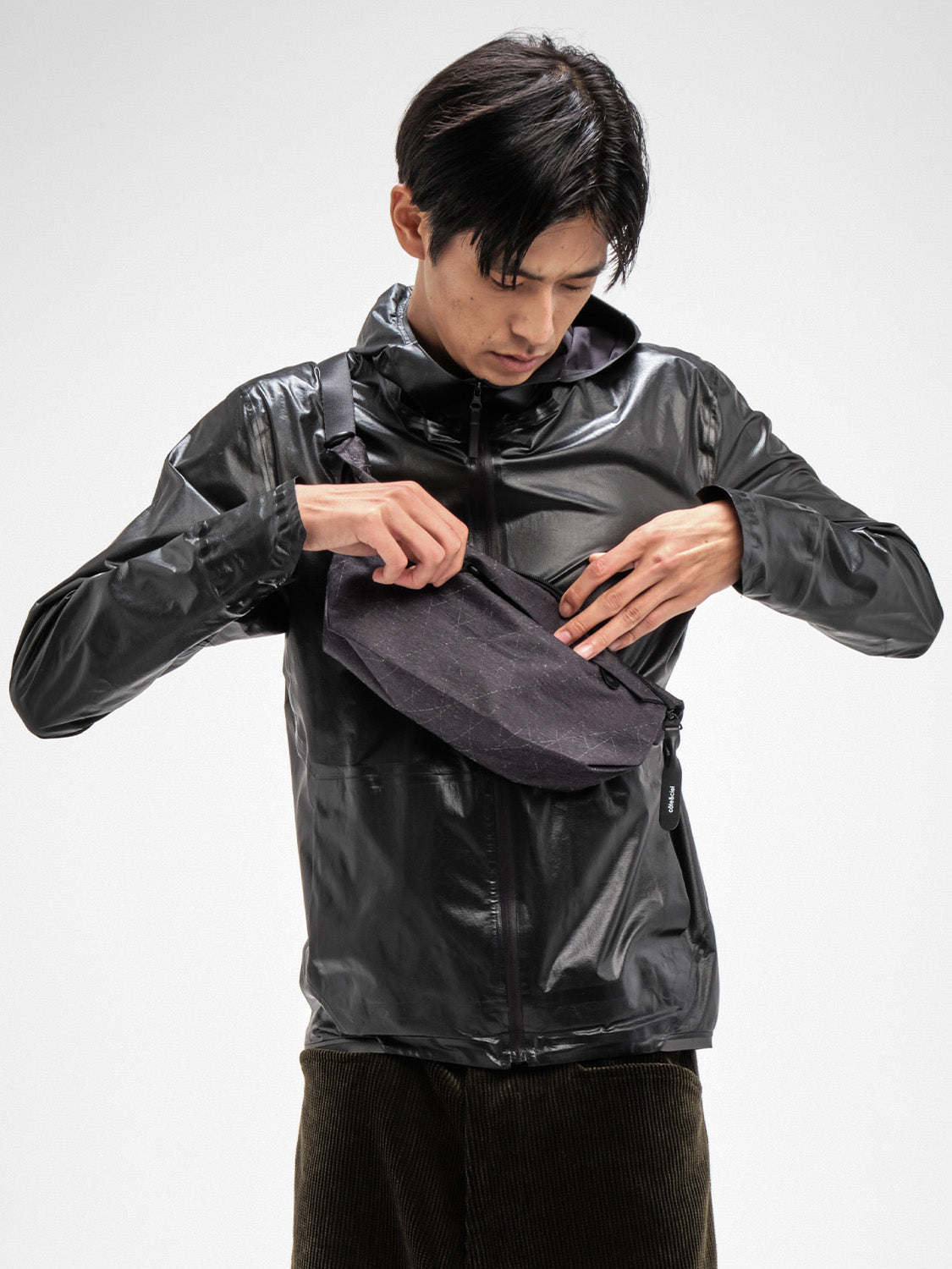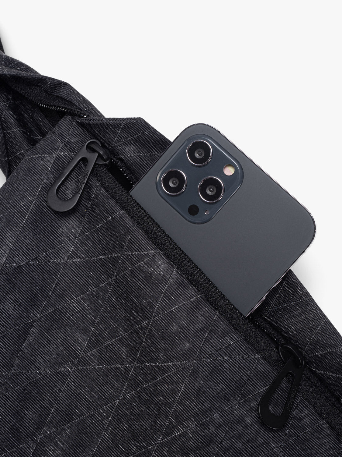 この黒いジッパー付きショルダーストラップは、ミニマルなクロスボディバッグとして、またはウエストに巻いて単独で使用できます。
