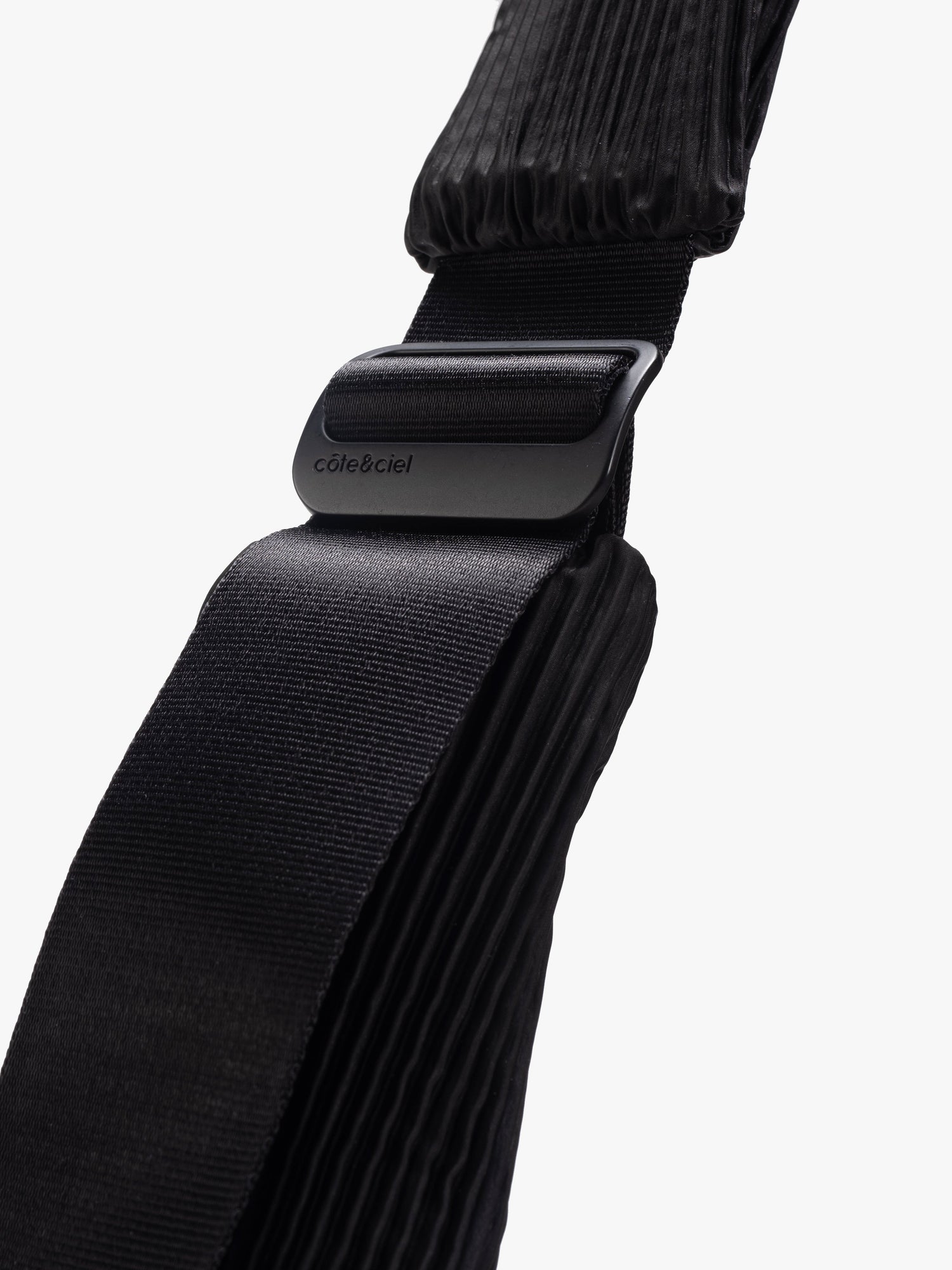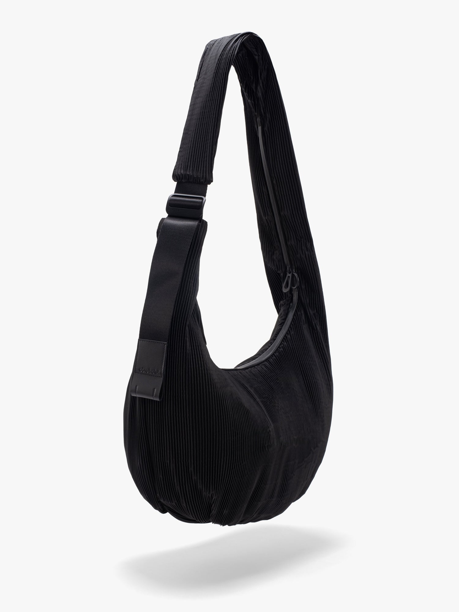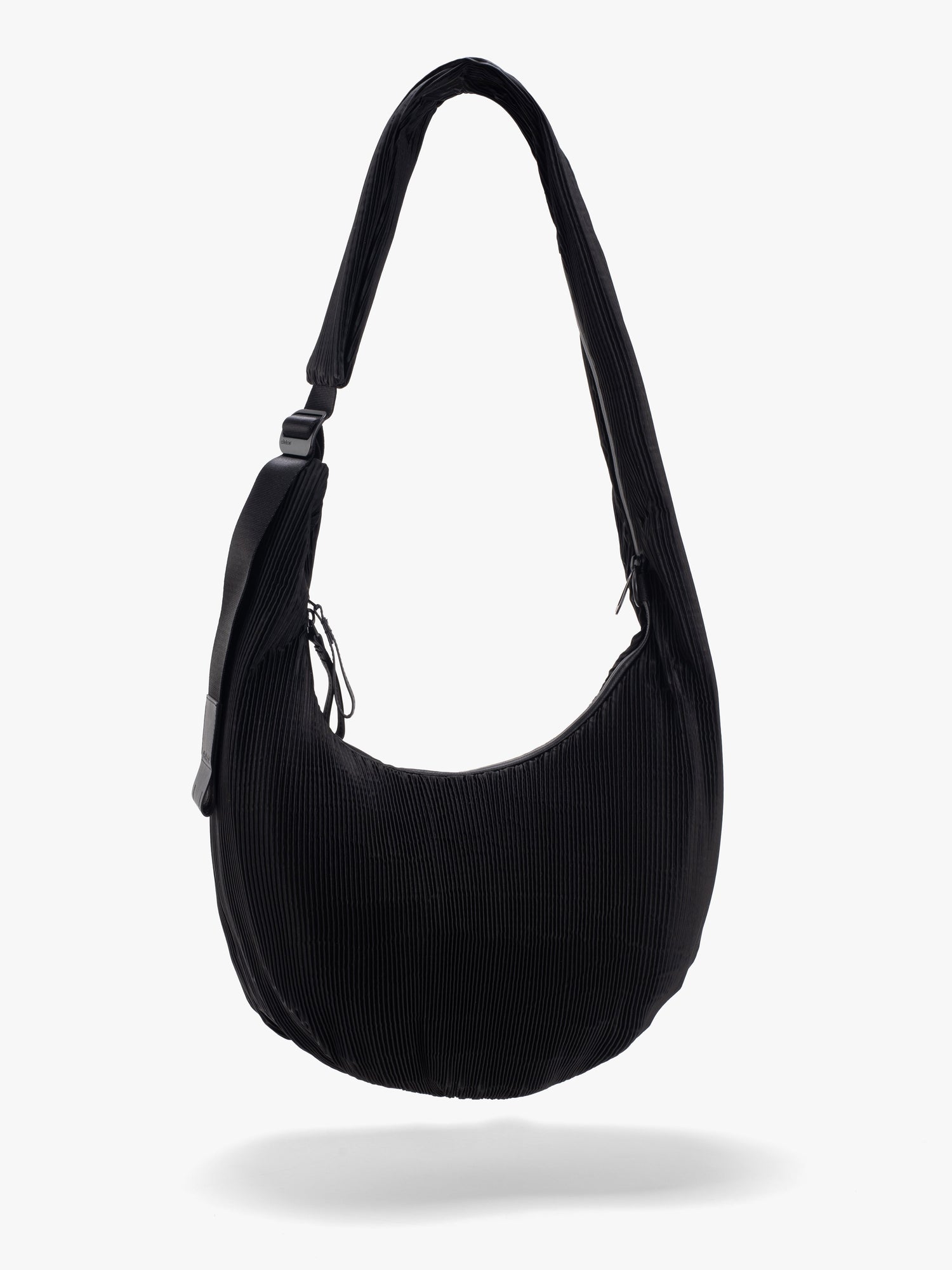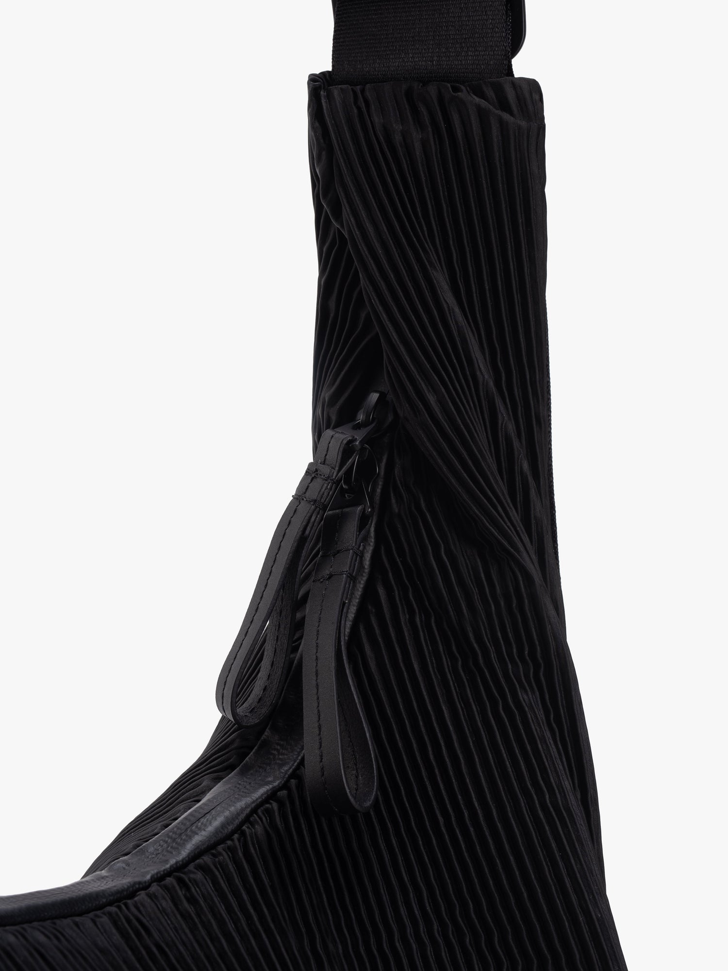 LetGoキーチェーンやアイウェア ポーチなどのアクセサリーや、LUVE MINIなどの小さなバッグを取り付けるために使用できるリングクリップも付いています。マット仕上げの柔らかな手触りのユニークな“Pleated Black”生地で作られています。