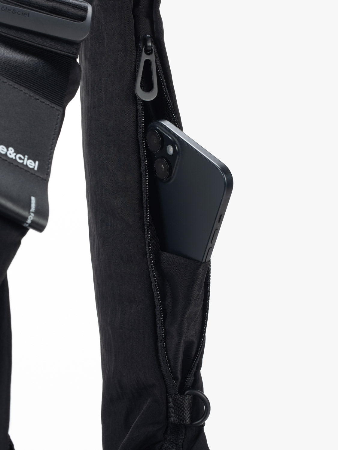 HYCO Sには、レザージッパーで固定されたメインコンパートメントが1つ、内側に丸いセキュリティポケットが2つ備わっています。ストラップには胸の高さにポケットが埋め込まれており、携帯電話やメトロカードなどを安全に収納できます。LetGoキーチェーンやアイウェア ポーチなどのアクセサリーや、LUVE MINIなどの小さなバッグを取り付けるために使用できるリングクリップも付いています。