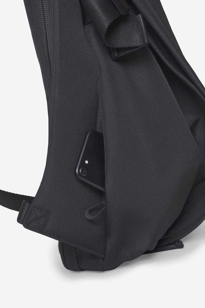 収納はメインコンパートメント、ラップトップ、シークレットポケットと大きく分けて3つあり、縦ジッパーが印象的なメインコンパートメントは2つのナイロンベルトの締め具合によって容量を可変できます。