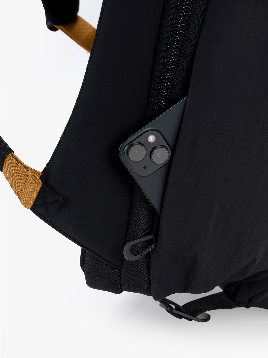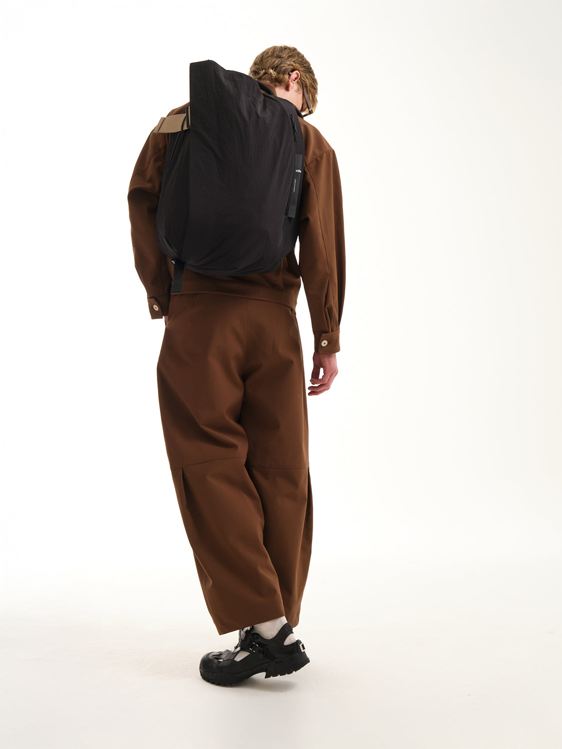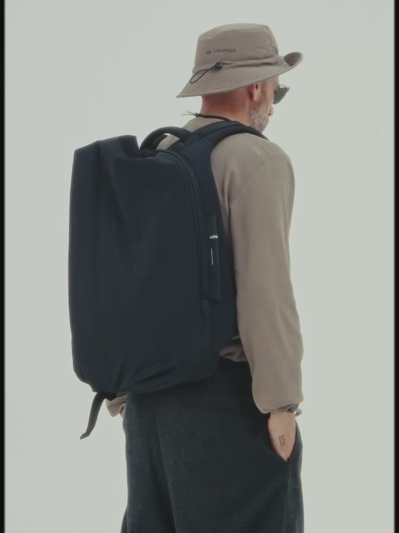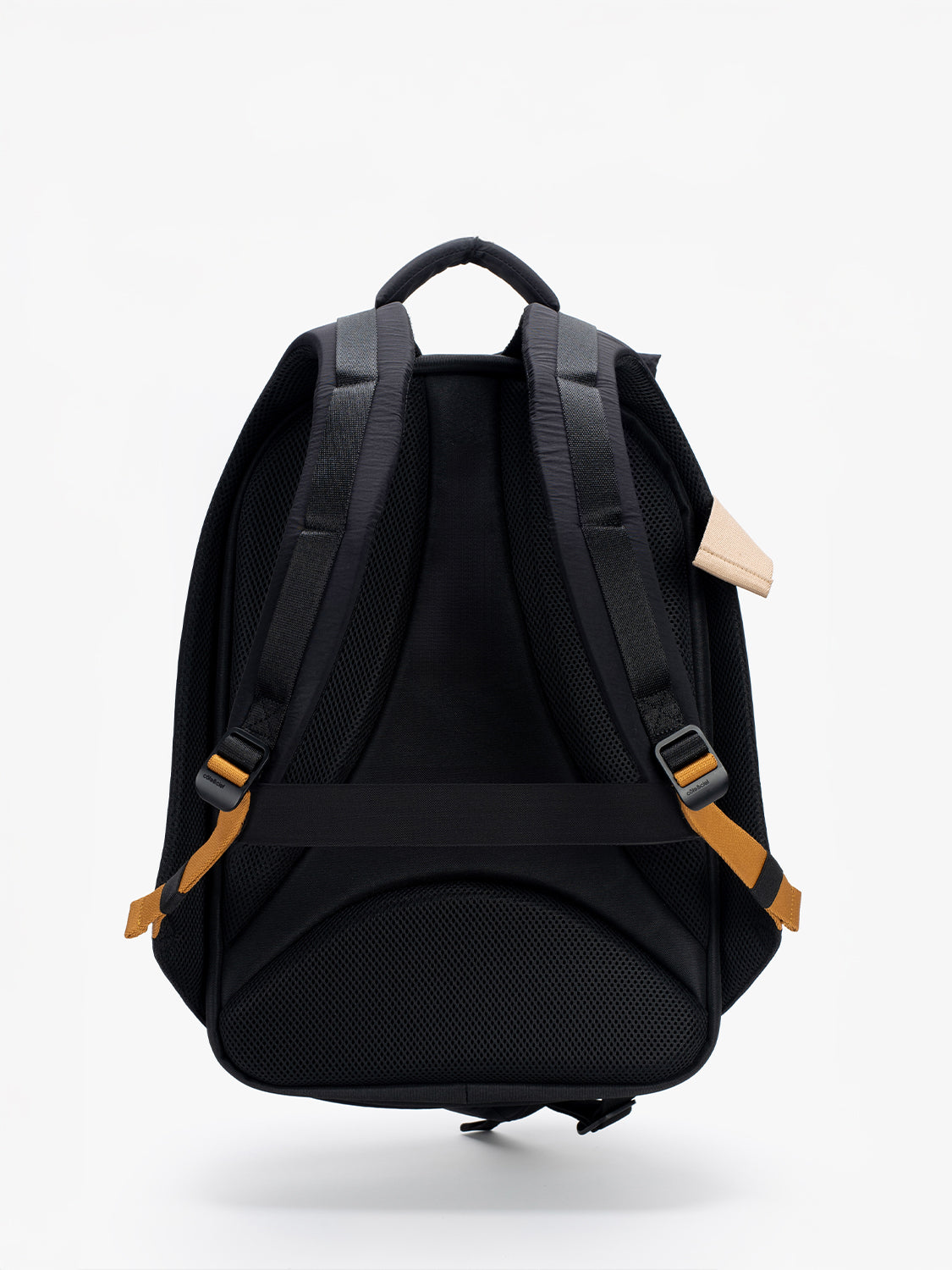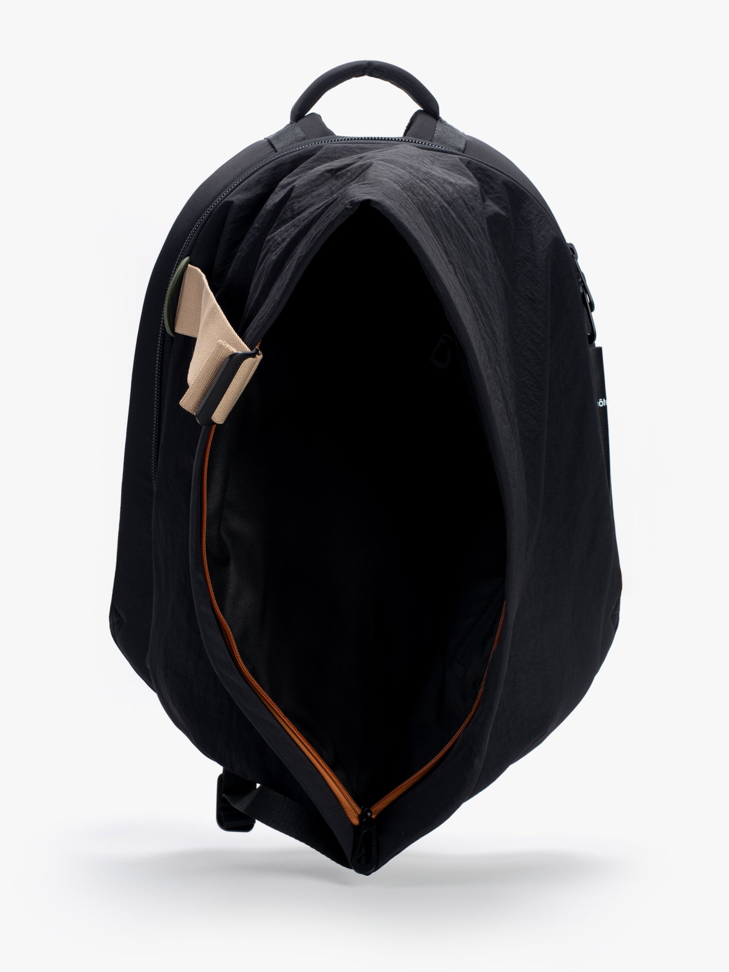 本体には「スムースブラック」生地を使用。外部のアジャスターはISAR Mのボリュームと連動し、荷重に応じて膨張したり圧縮したりします。また、人間工学に基づいた形状のバックパネルを備えています。