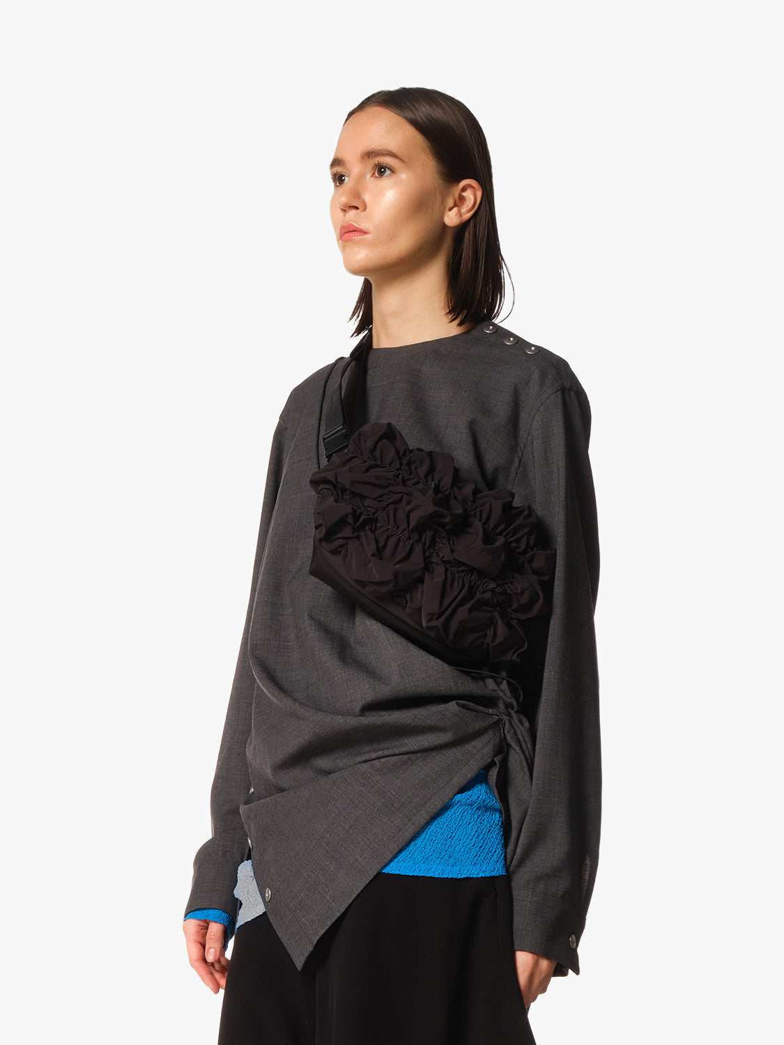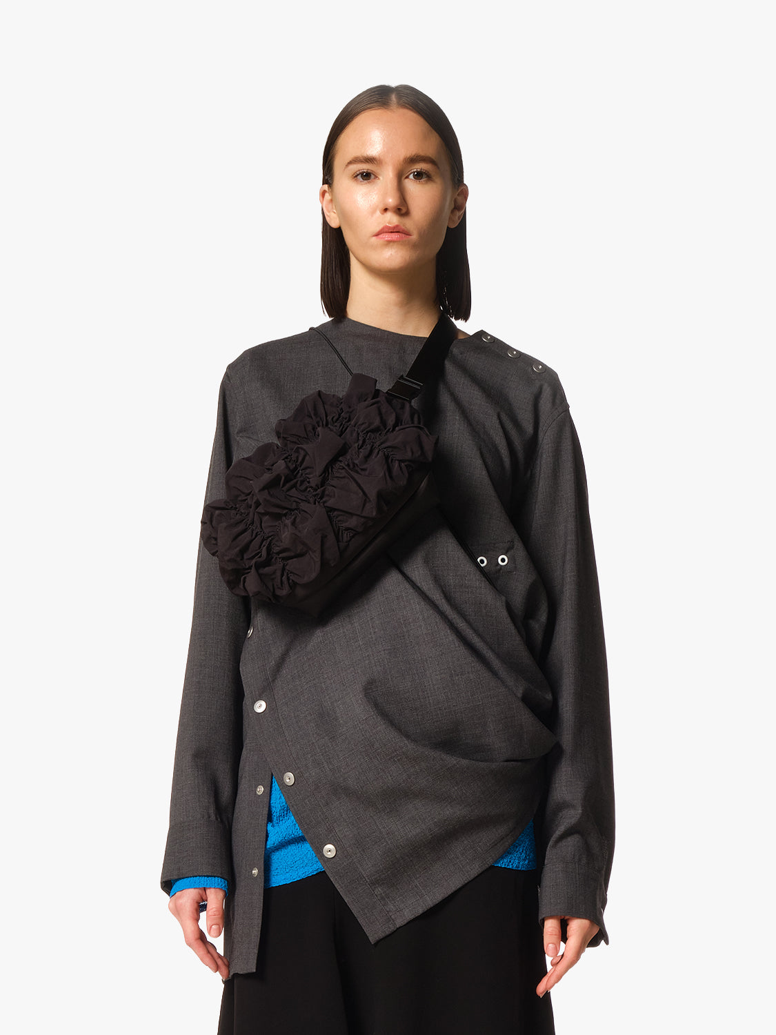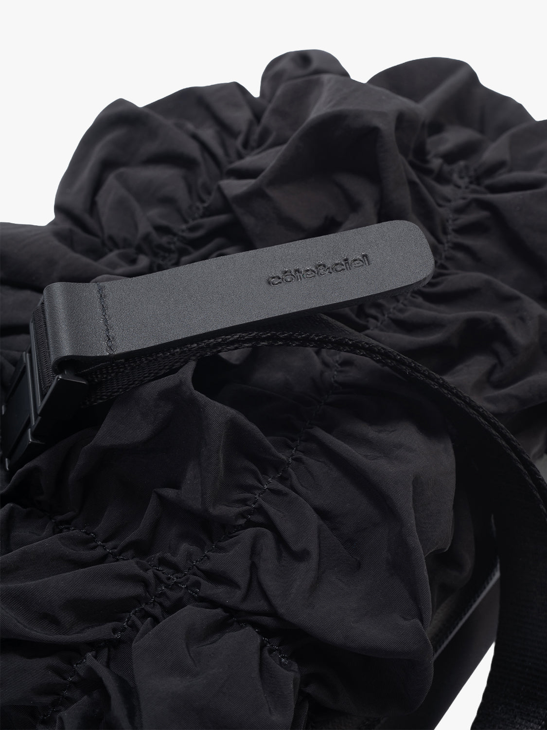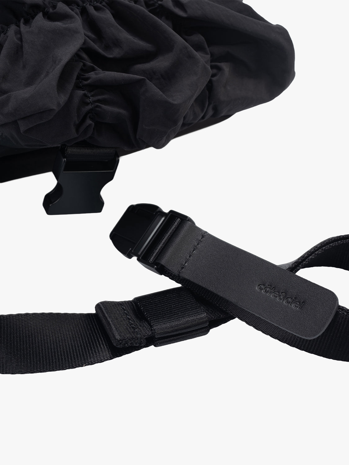 「Gathered Black」ファブリックを採用しており、滑らかなナイロン素材に柔らかな折り目を加えることで、彫刻のような独特のフォルムを実現しました。日々の必需品を腰回りや肩に掛けて安全に持ち運ぶことができ、実用的な機能性と存在感のあるシルエットを兼ね備えています。