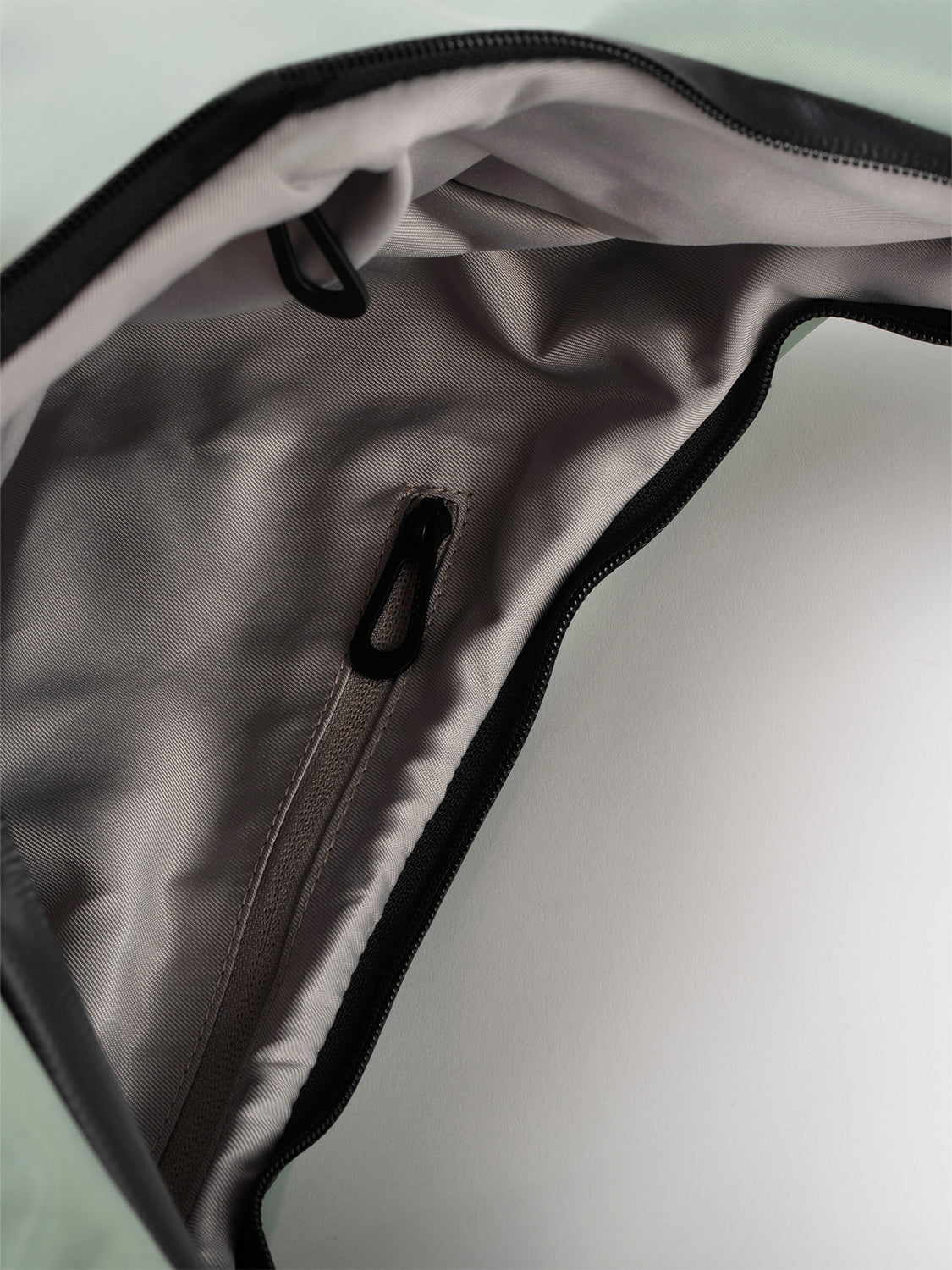 季節のセージグリーンカラーの滑らかなナイロンで作られたこのバッグは、マットブラックの金具で引き立てられ、洗練されたコントラストを加えています。調節可能なストラップでさまざまな持ち運びが可能で、毎日の使用に最適です。