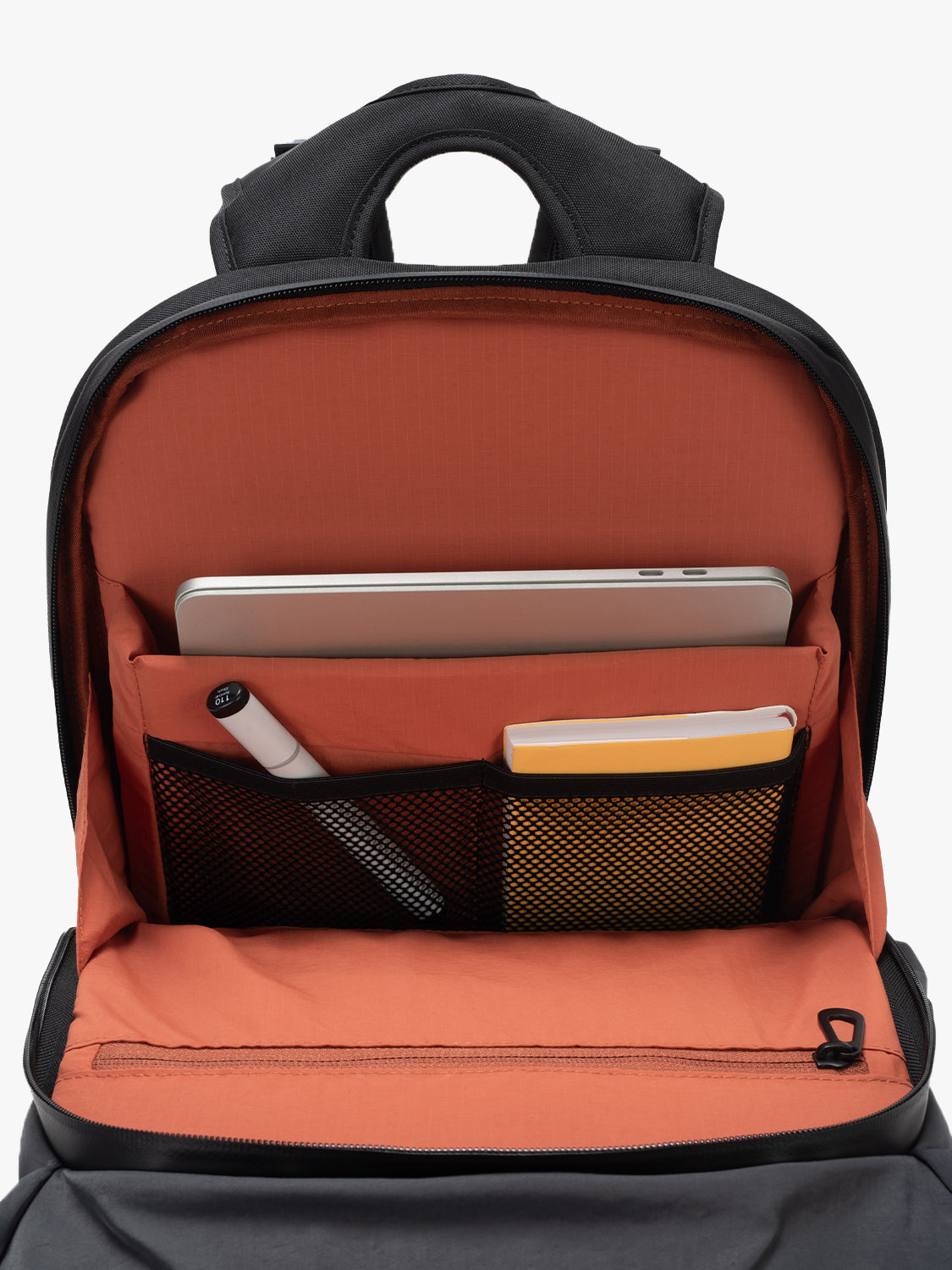 繭のようなフォルムのNILEを開けると、15インチまでのデバイスを安全に収納できるラップトップポケットが内蔵されています。