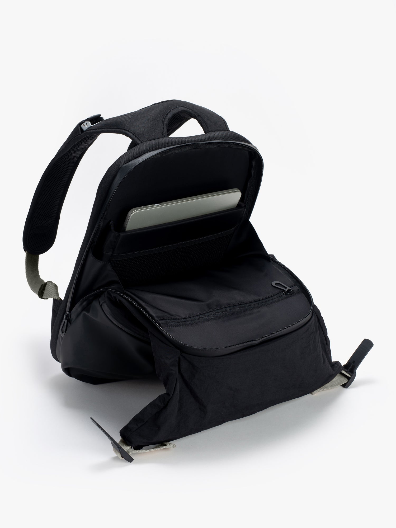 Nile Obsidian の繭のような形状を開くと、一体型のラップトップ ポケットが現れ、最大 15 インチまでのデバイスを安全に収納できます。