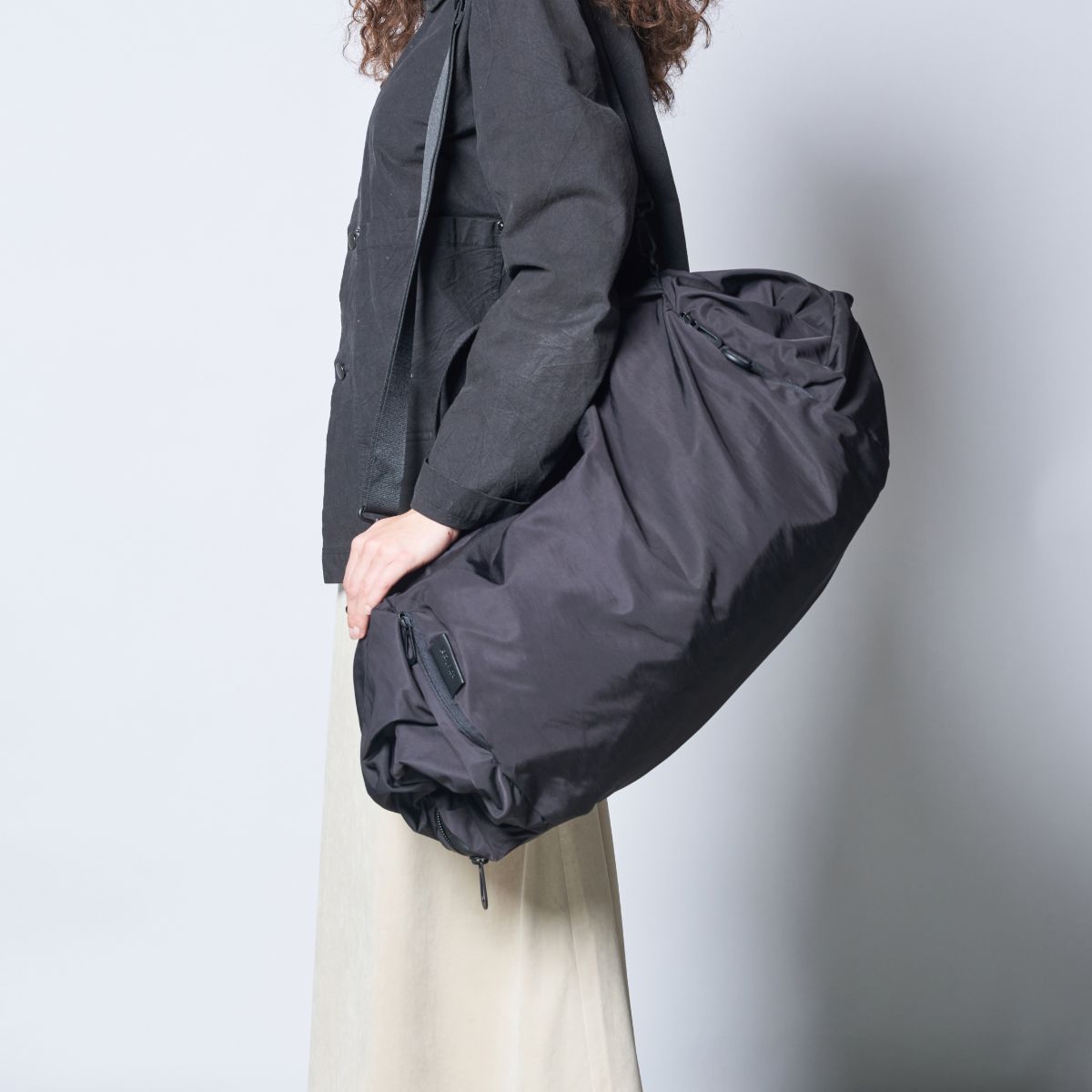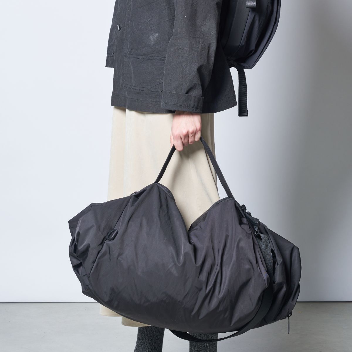 OBEDは大型のダッフルバッグで、短いストラップを使って手で持ち運んだり、ジッパー付きのADDAショルダーストラップを組み合わせて、肩掛けやバックパックなど様々な方法で持ち運ぶことができます。軽量なナイロン製で、ユニークなトラベルギアとして、外出先でも活躍します。