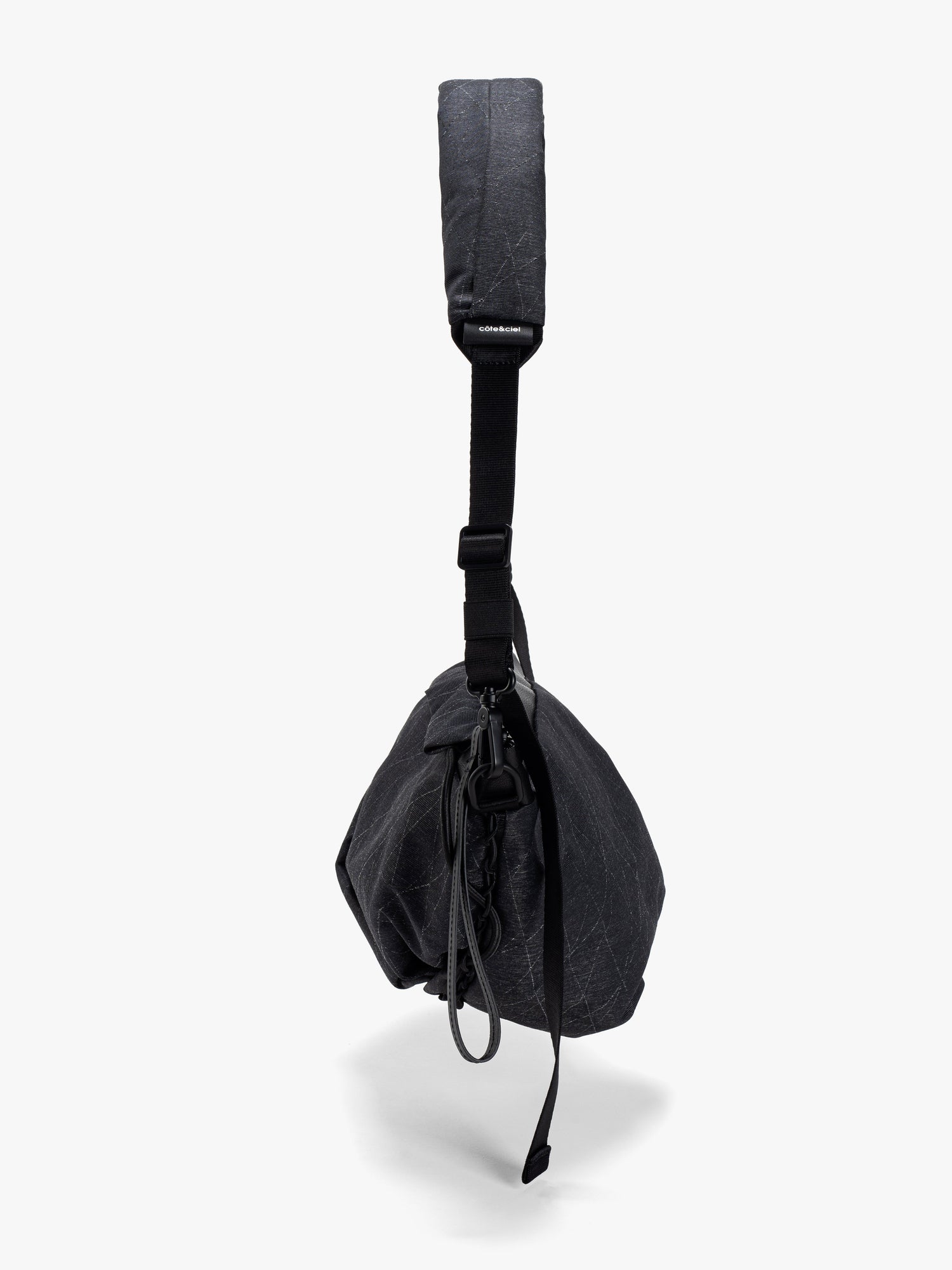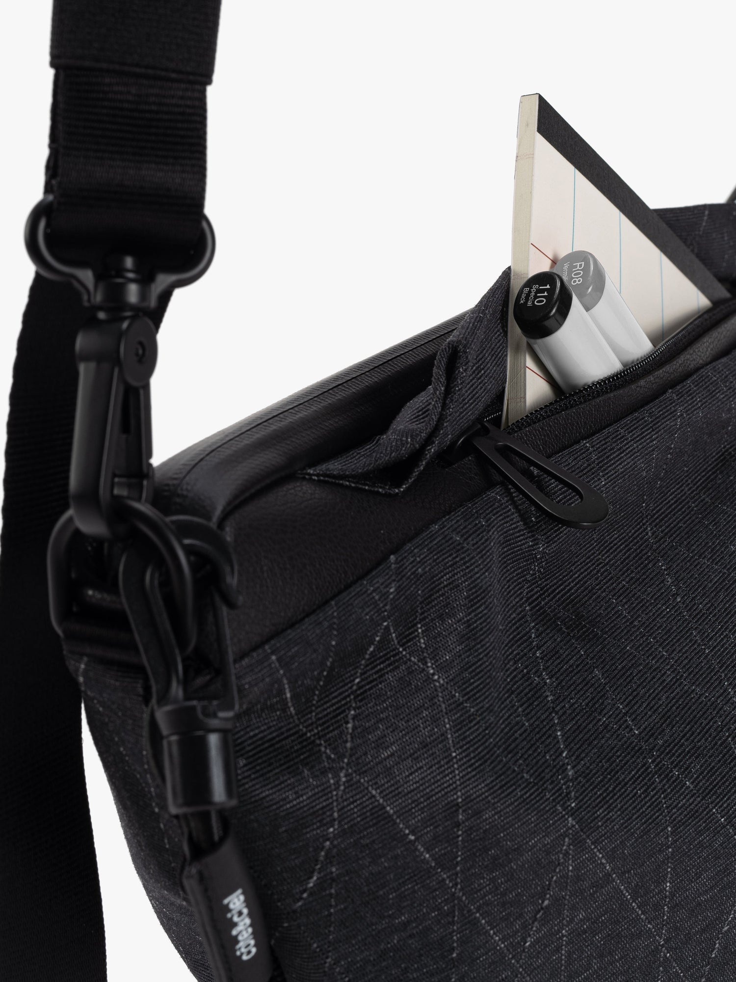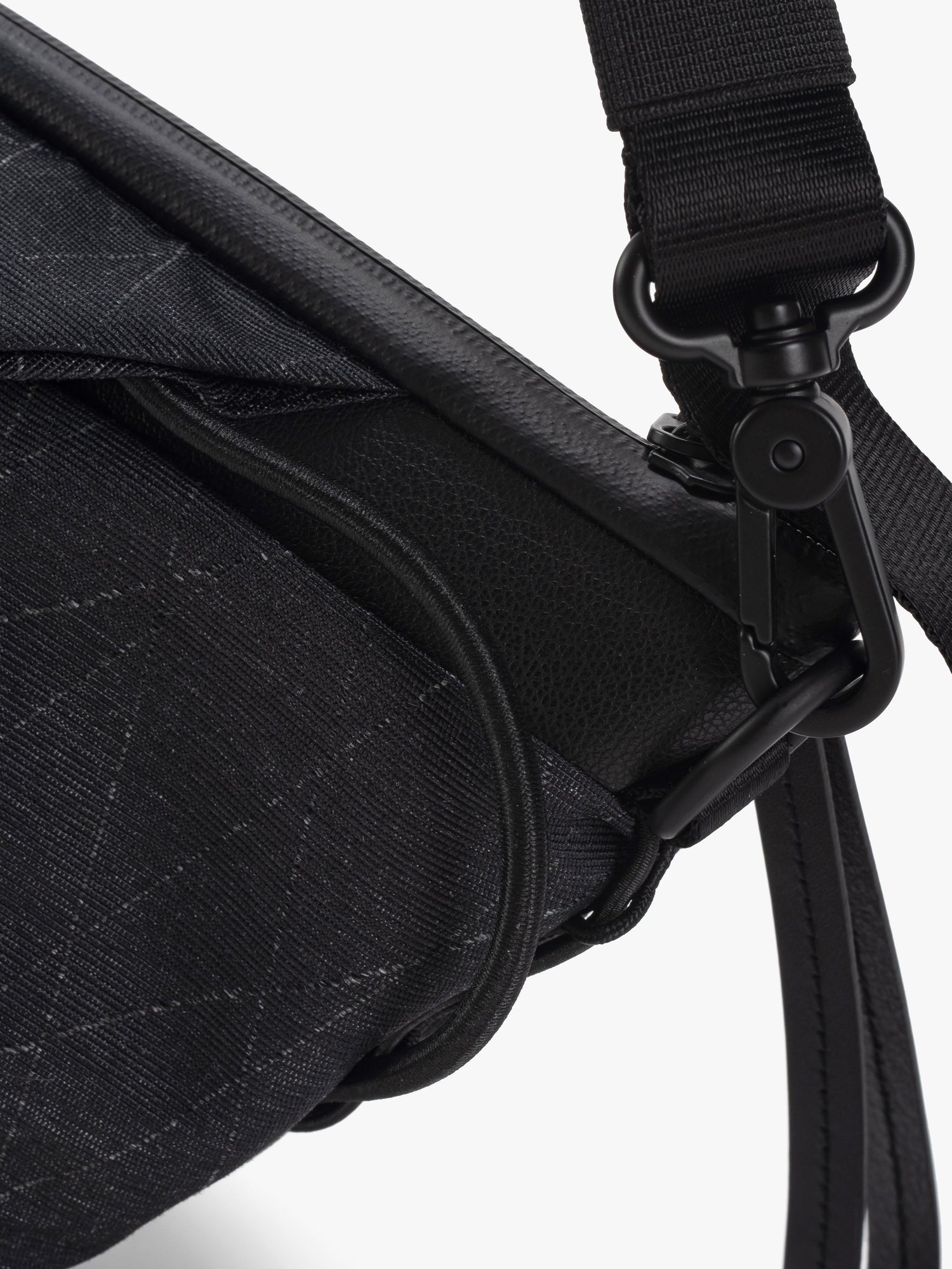 ORNEにはメインコンパートメントが1つと、内部にセキュリティポケットが付いています。外側にはリサイクルレザーをアクセントにした外ポケットがあり、バッグ周囲に着くゴム紐はキーホルダーとしても使用可能です。