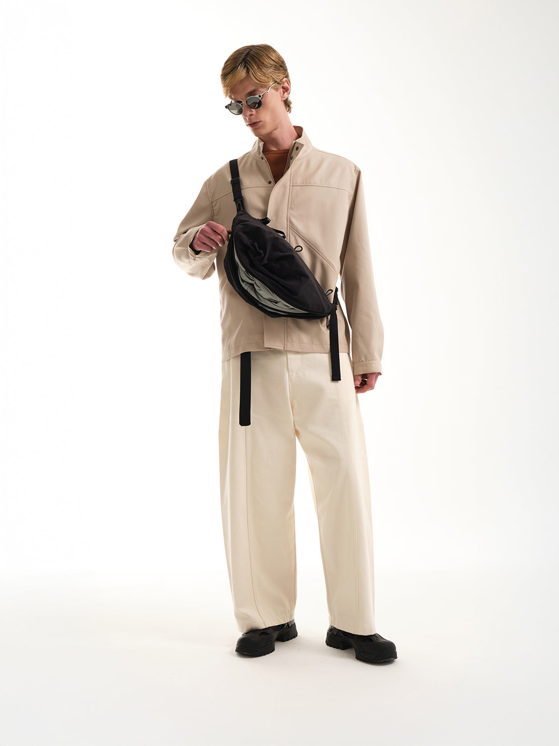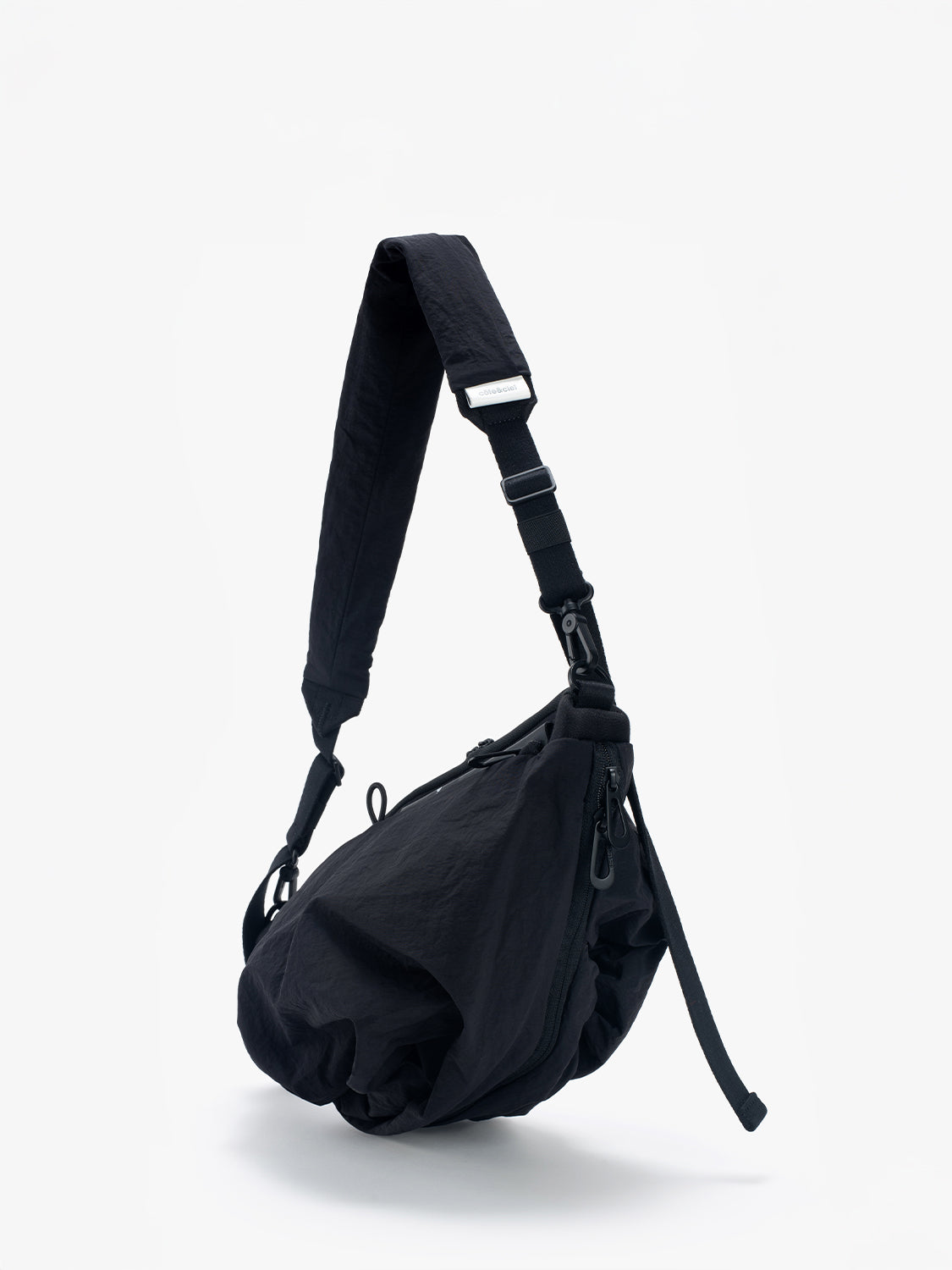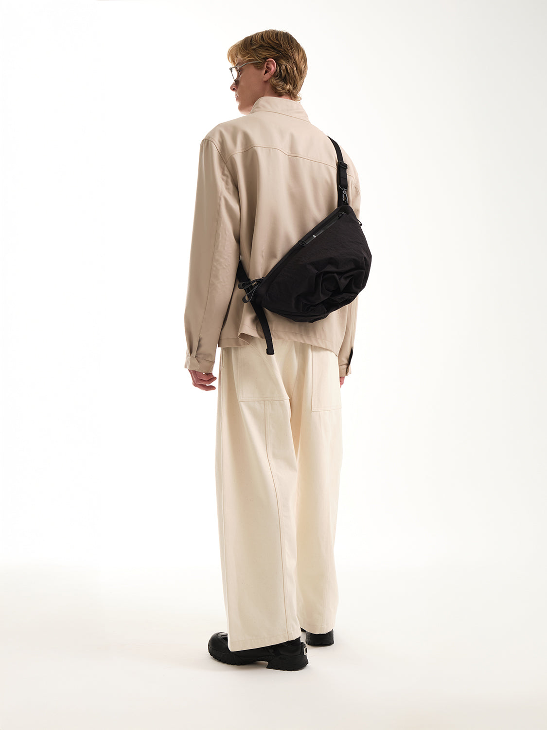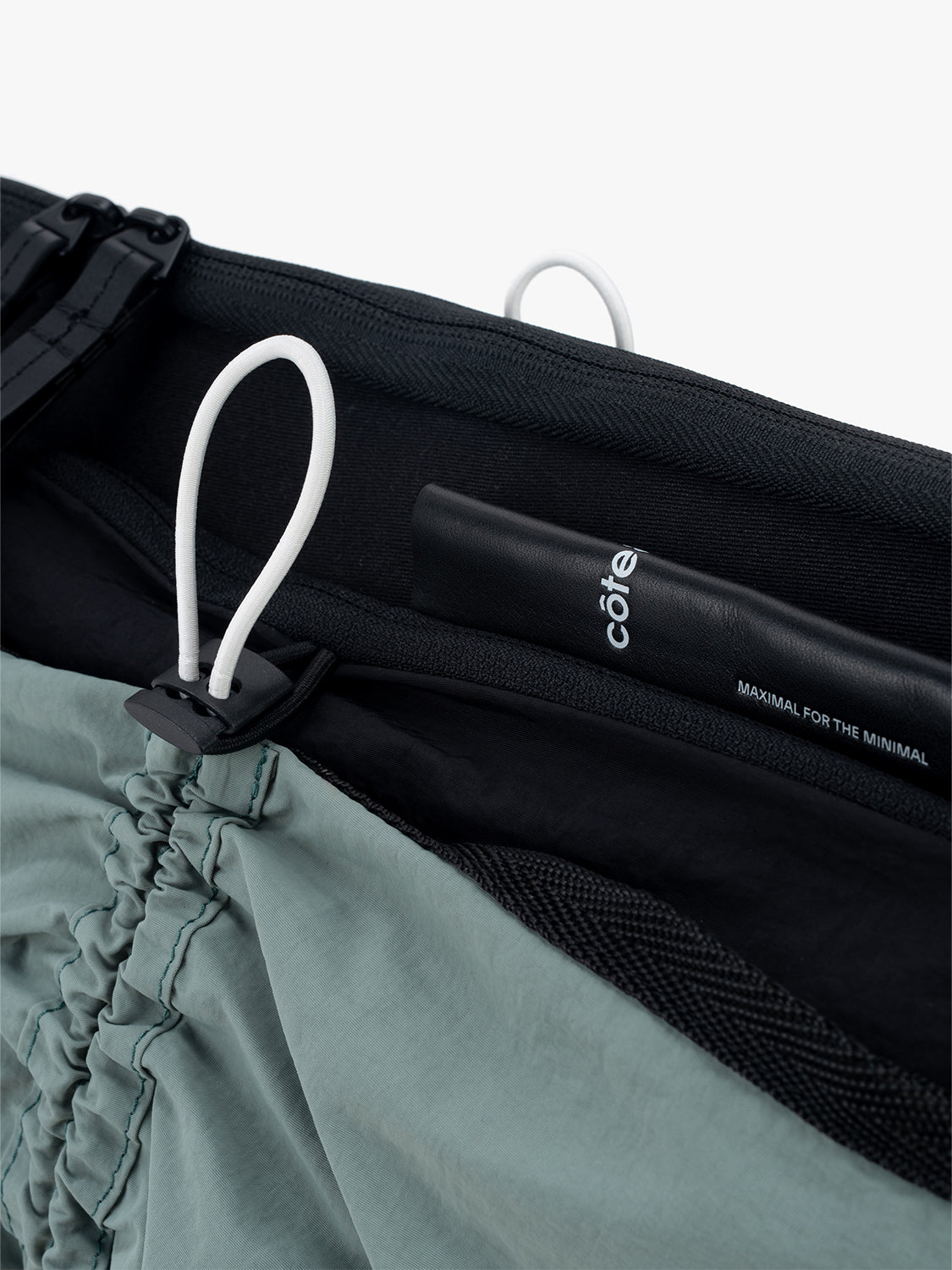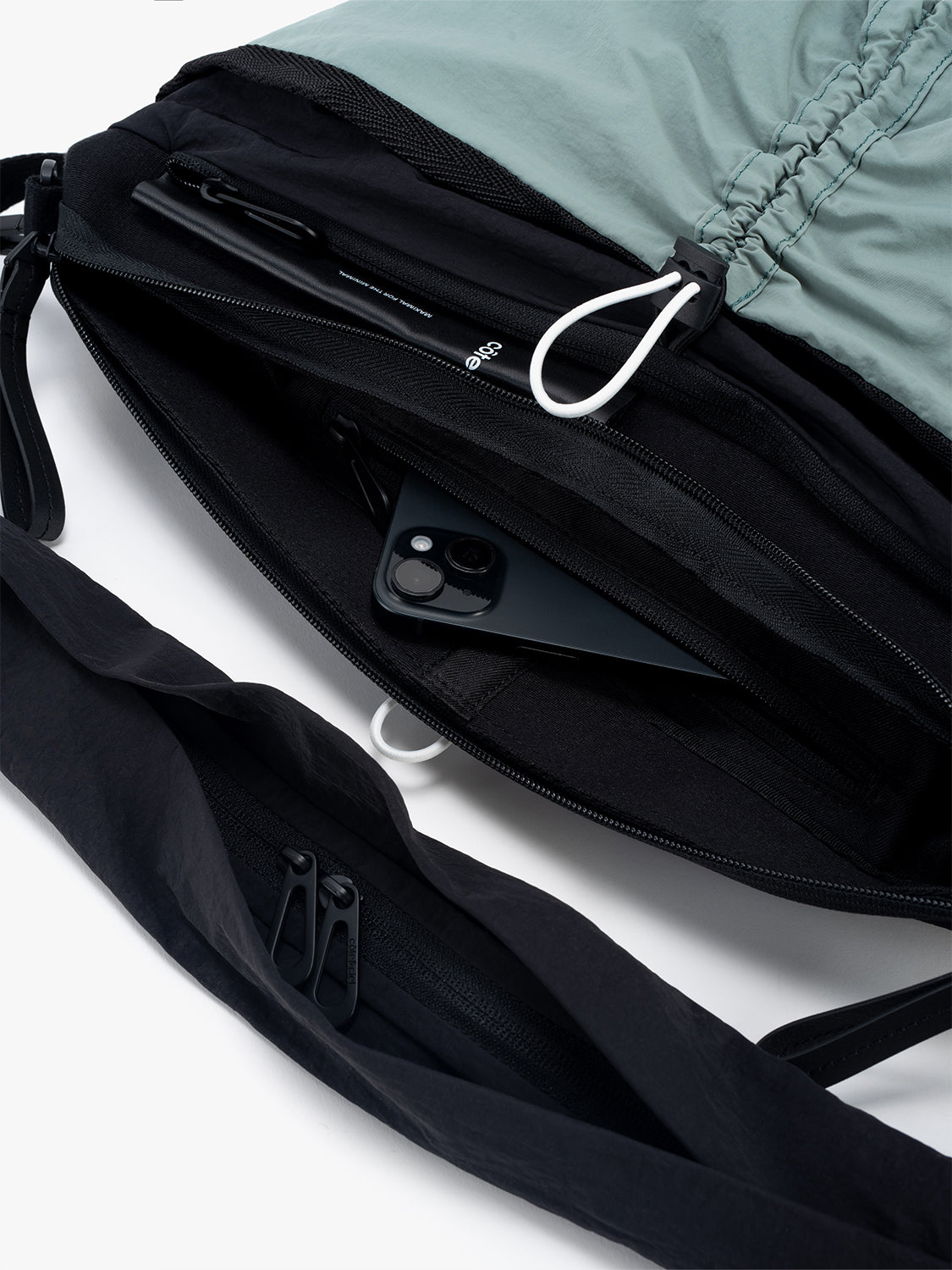 ORNE は、ユーザーのシルエットに相互作用するように設計されています。バッグ底部の素材に遊び心のあるひねりを加え、動きのある印象に仕上げました。バッグが変形してセージ グリーンが現れると、生地に面白いひだができ、アクセントになります。