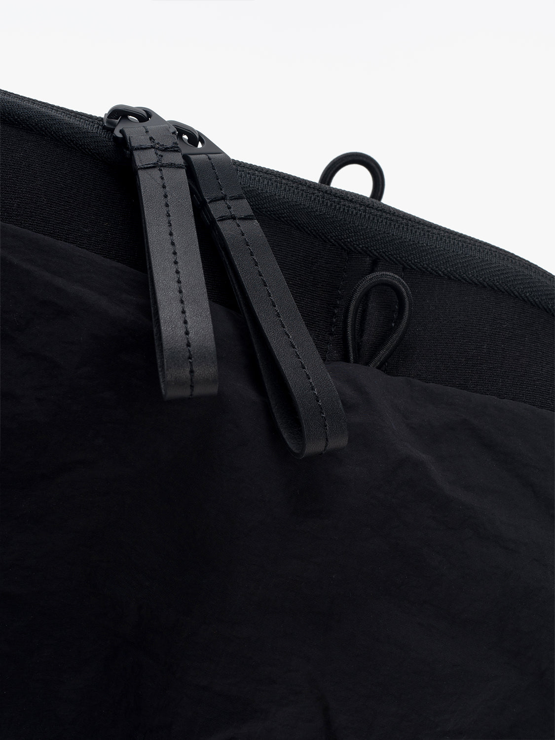メインコンパートメントは撥水ファスナーが使用されておりしっかりと開閉します。外側にはcôte&cielのブランドロゴがエンボス加工されたレザータグ、隠しポケット、LetGoキーチェーンを取り付けるためのループが付いています。