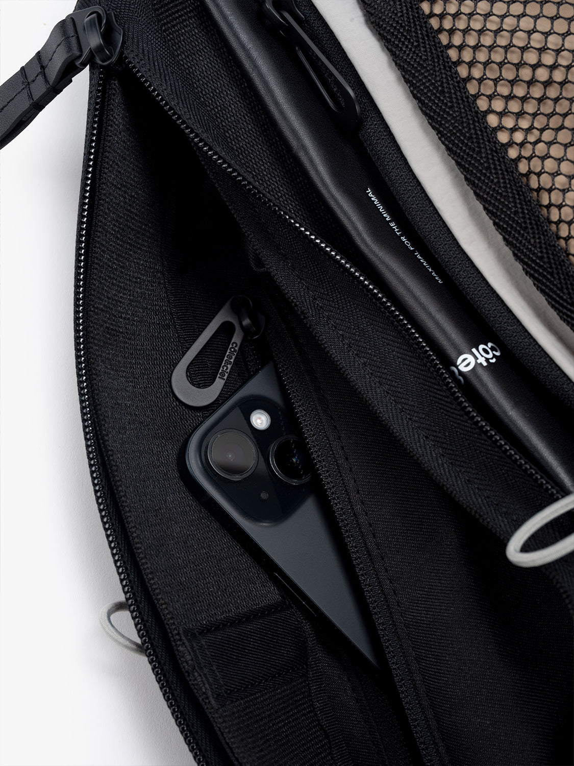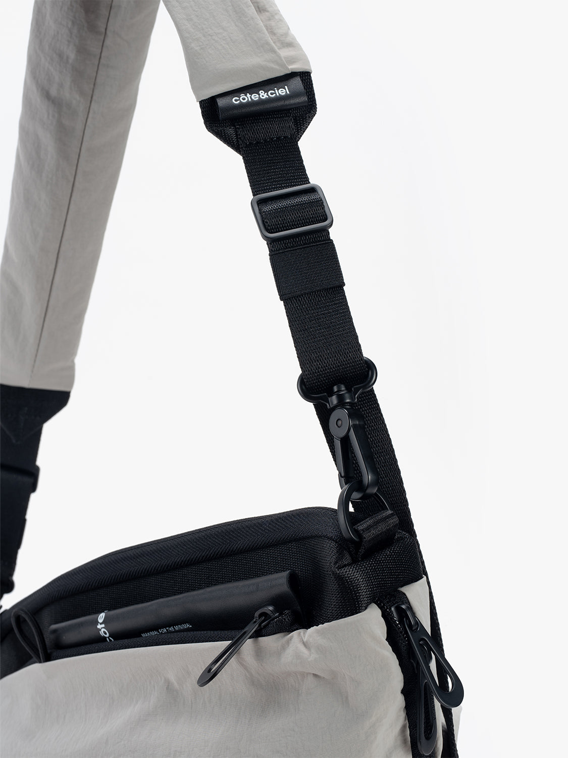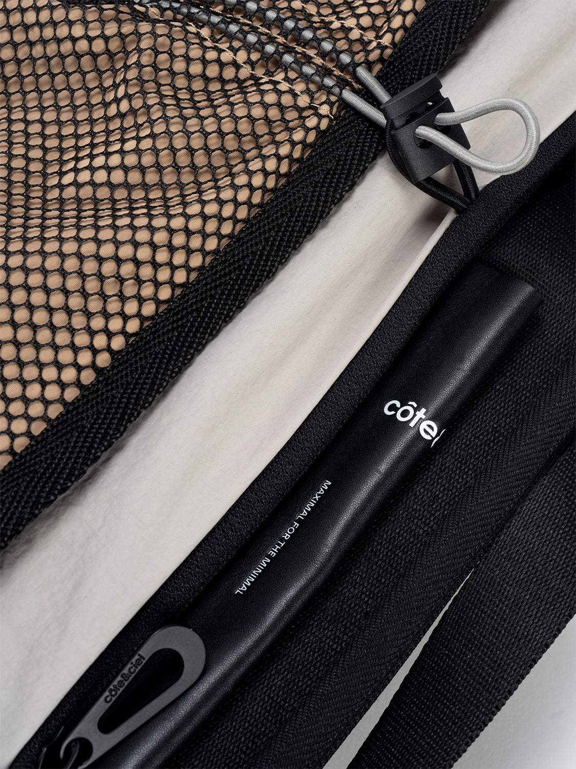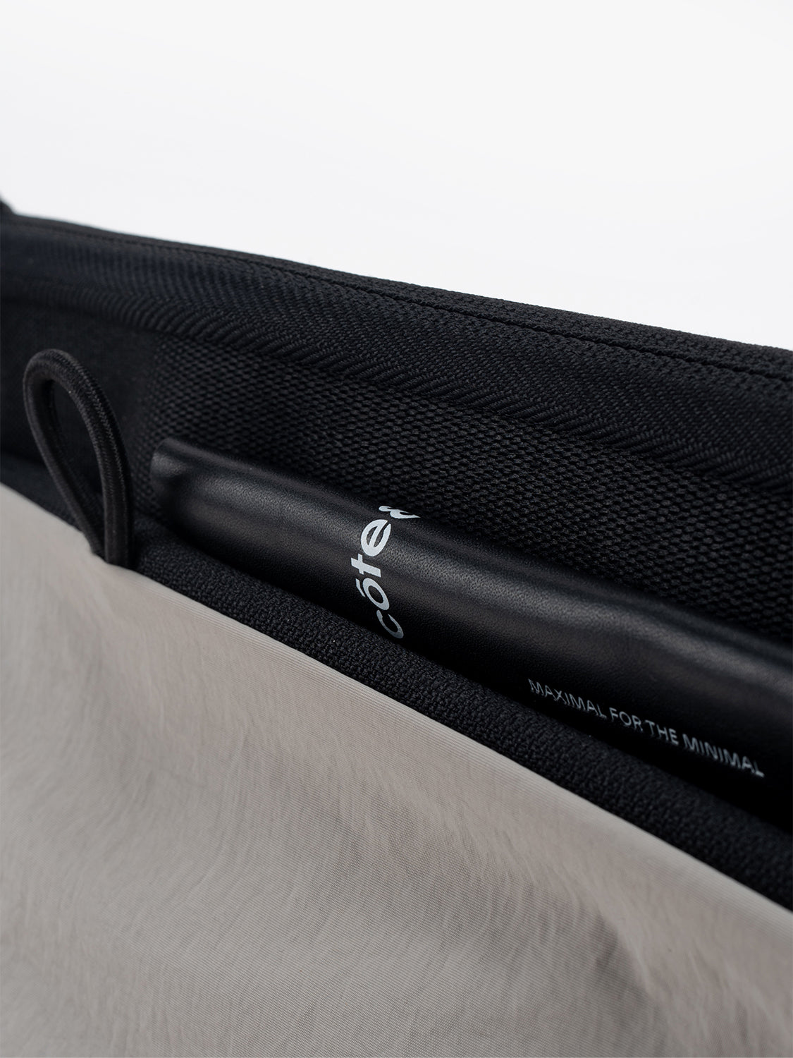 メインコンパートメントは撥水ファスナーが使用されておりしっかりと開閉します。外側にはcôte&cielのブランドロゴがエンボス加工されたレザータグ、隠しポケット、LetGoキーチェーンを取り付けるためのループが付いています。