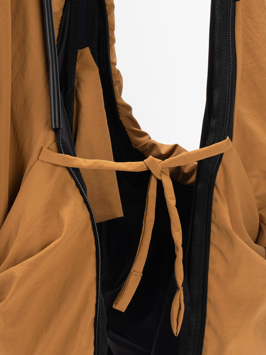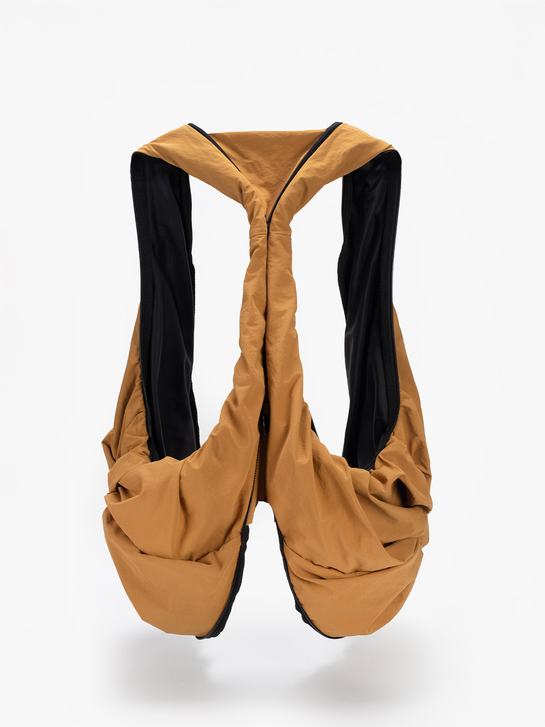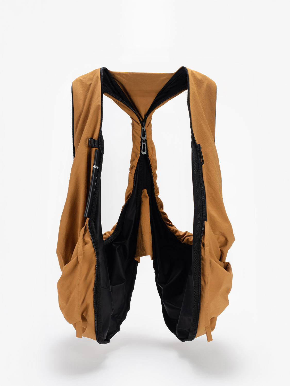 「スムースサンレイ」ナイロンを使用したPOは、côte&cielの「持ち歩くものではなく、着るバッグ」というモットーを体現しており、瞬時にウェアラブルなジレに変身できるハイブリッドなトートバッグです。中央のジッパーを使用すれば、PO の第 2 形態へ変形できます。