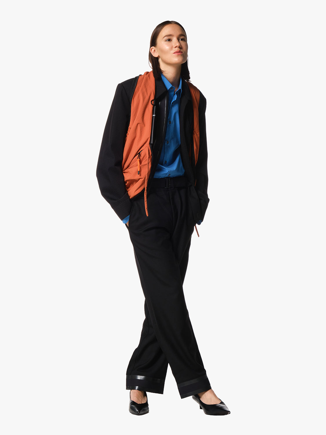折り紙の原理を取り入れた「PO」の構造は、バッグ・ジレいずれの形態においても、複雑に重なり合うレイヤーを形成します。外装には2つの隠しポケットと、LETGOなどの小物を装着できるDリングクリップが備わっています。