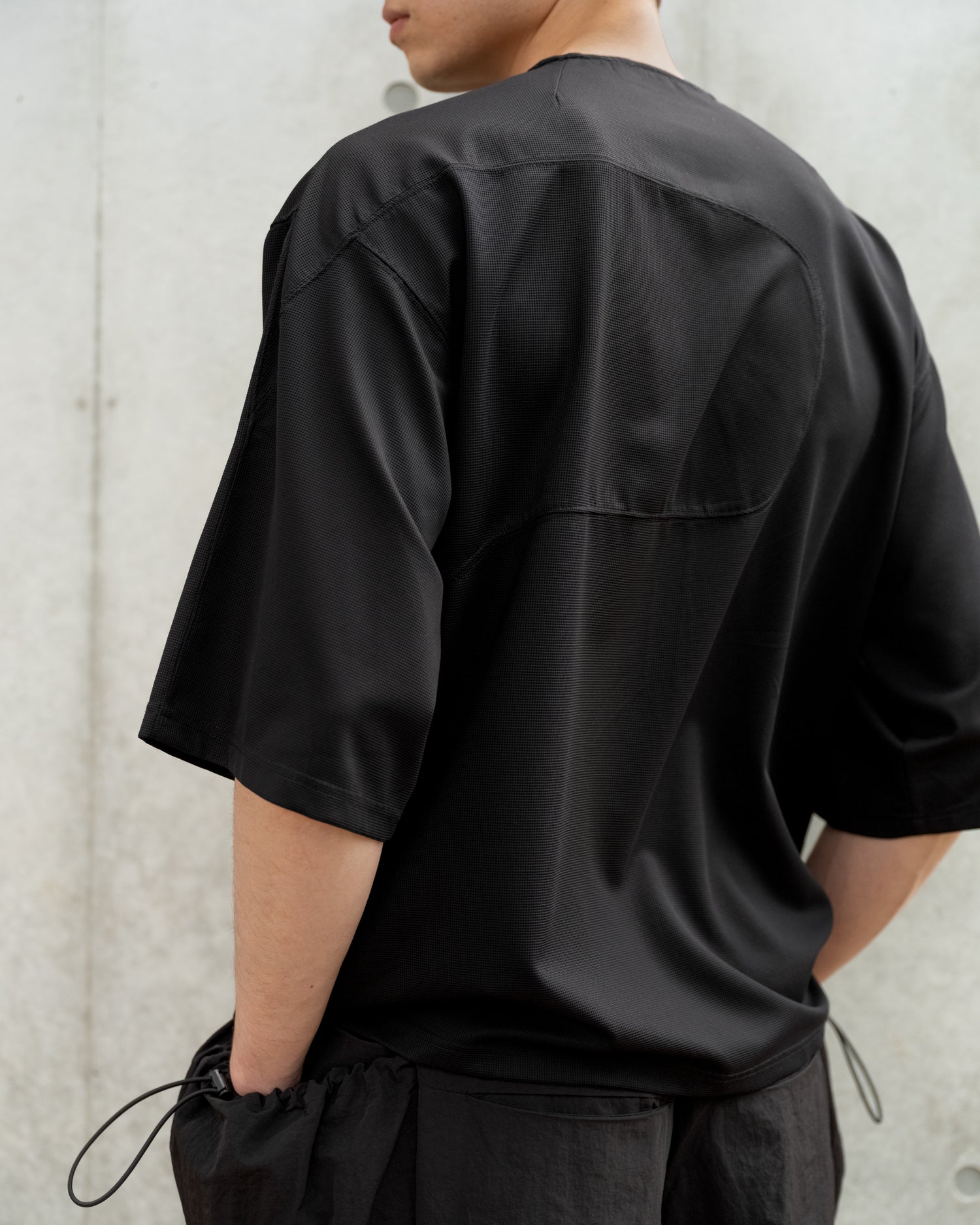 通気性と速乾性を備えたナイロン素材を採用し、ダーツを施したネックラインが身体に沿うようなフィット感を生み出しながらも、動きを妨げません。