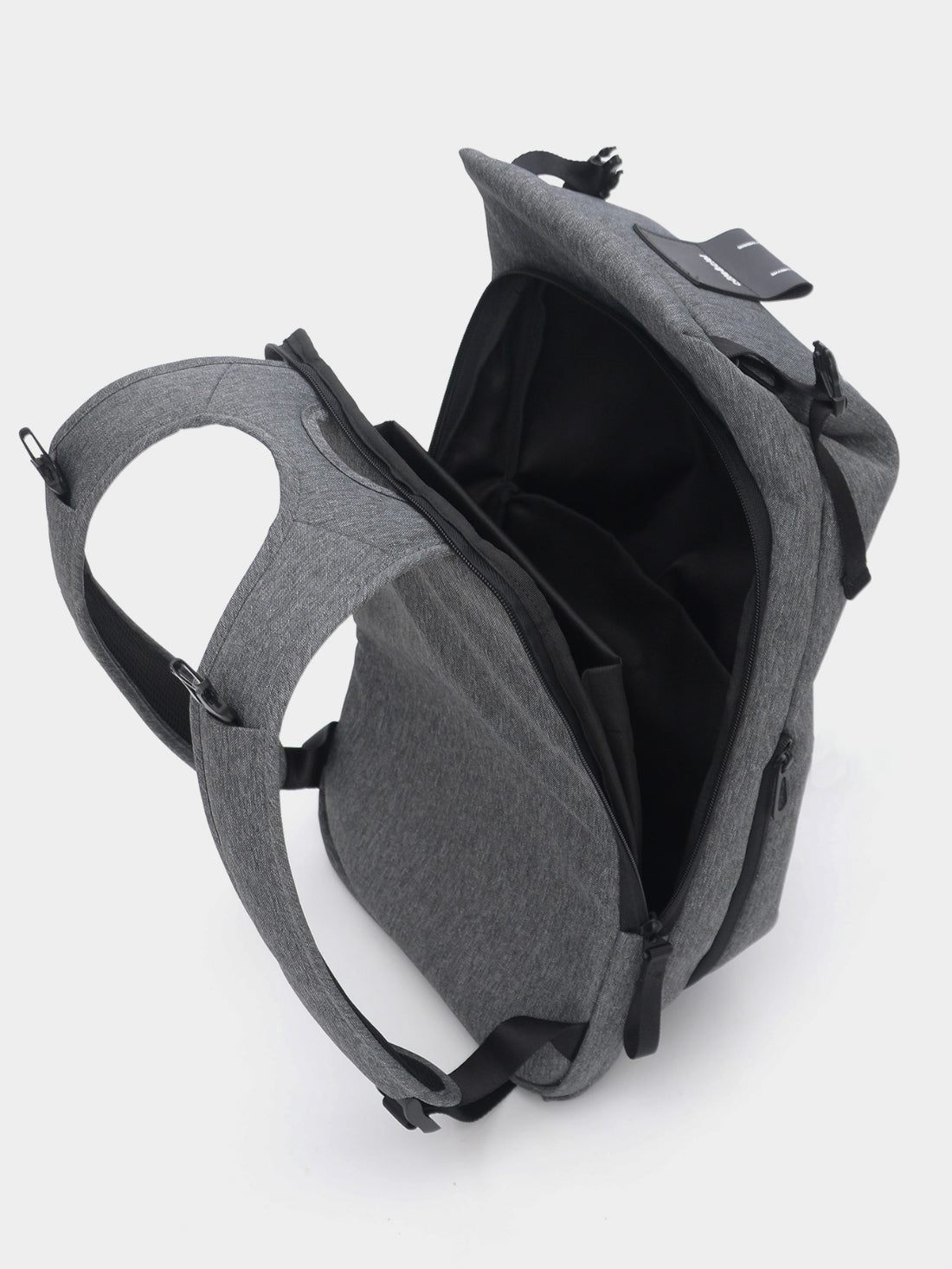 SARUには3つの外部ポケットがあります。 1つはシェル上部のストラップの間に、もう1つはメインコンパートメントの下部の両側にあります。上部の2つのバックルを開けると、メインコンパートメントがあり、16インチまでのノートパソコンが入るパッド付きデバイスポケットが付いています。 このユニークな構造により、ノートパソコンを盗難から守ります。 ラップトップ・コンパートメントの前面には2つのアクセサリー・ポーチがあり、ペンやケーブルを整理してアクセスしやすくするのに便利です。