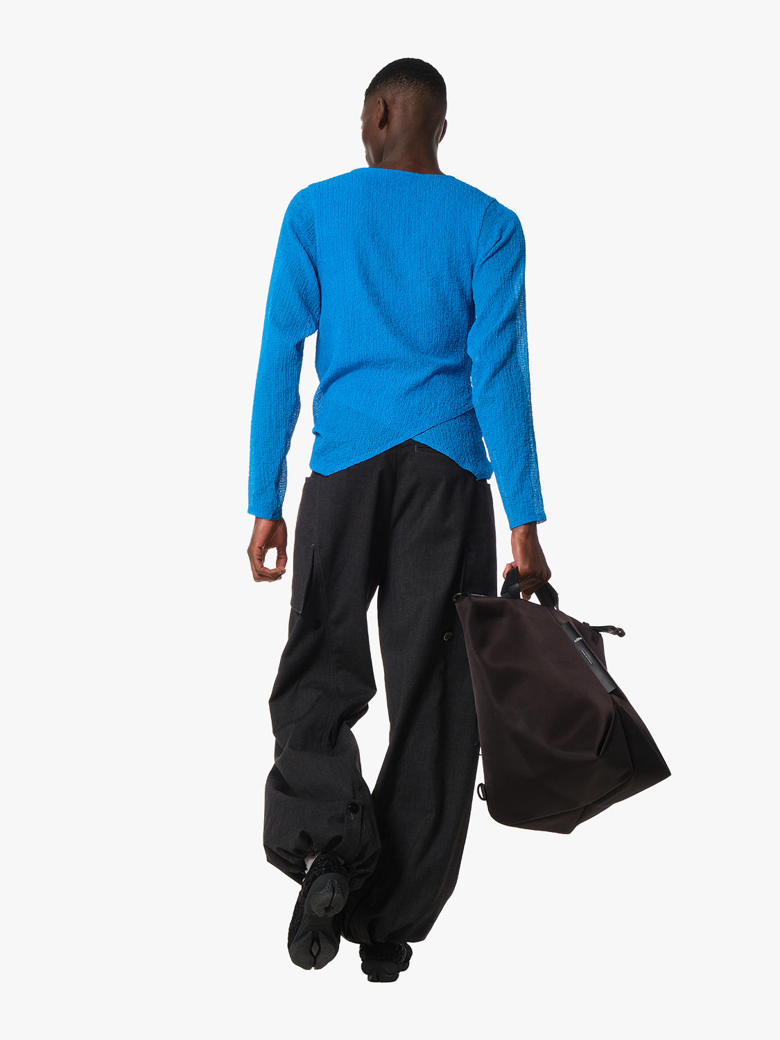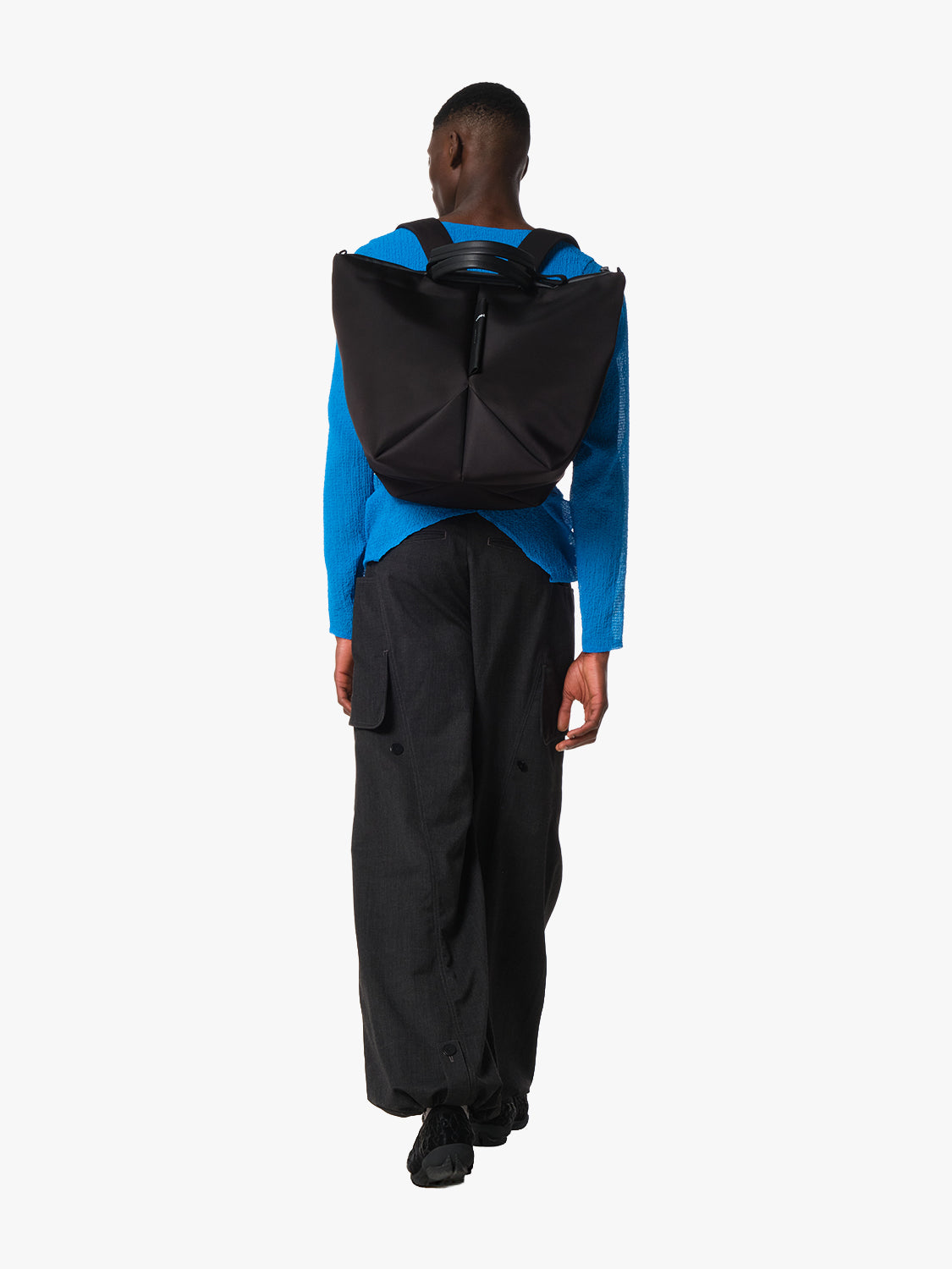 「TAMU」は、AMUから着想を得た、建築的で折り紙のようなベースのデザインが特徴の洗練されたブラックバックパックです。
