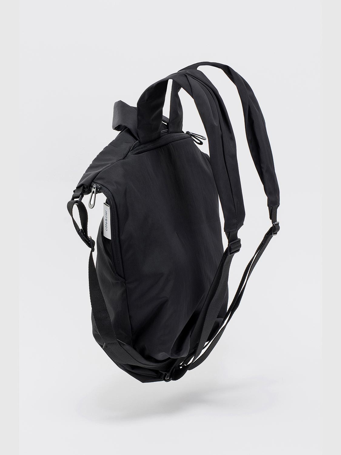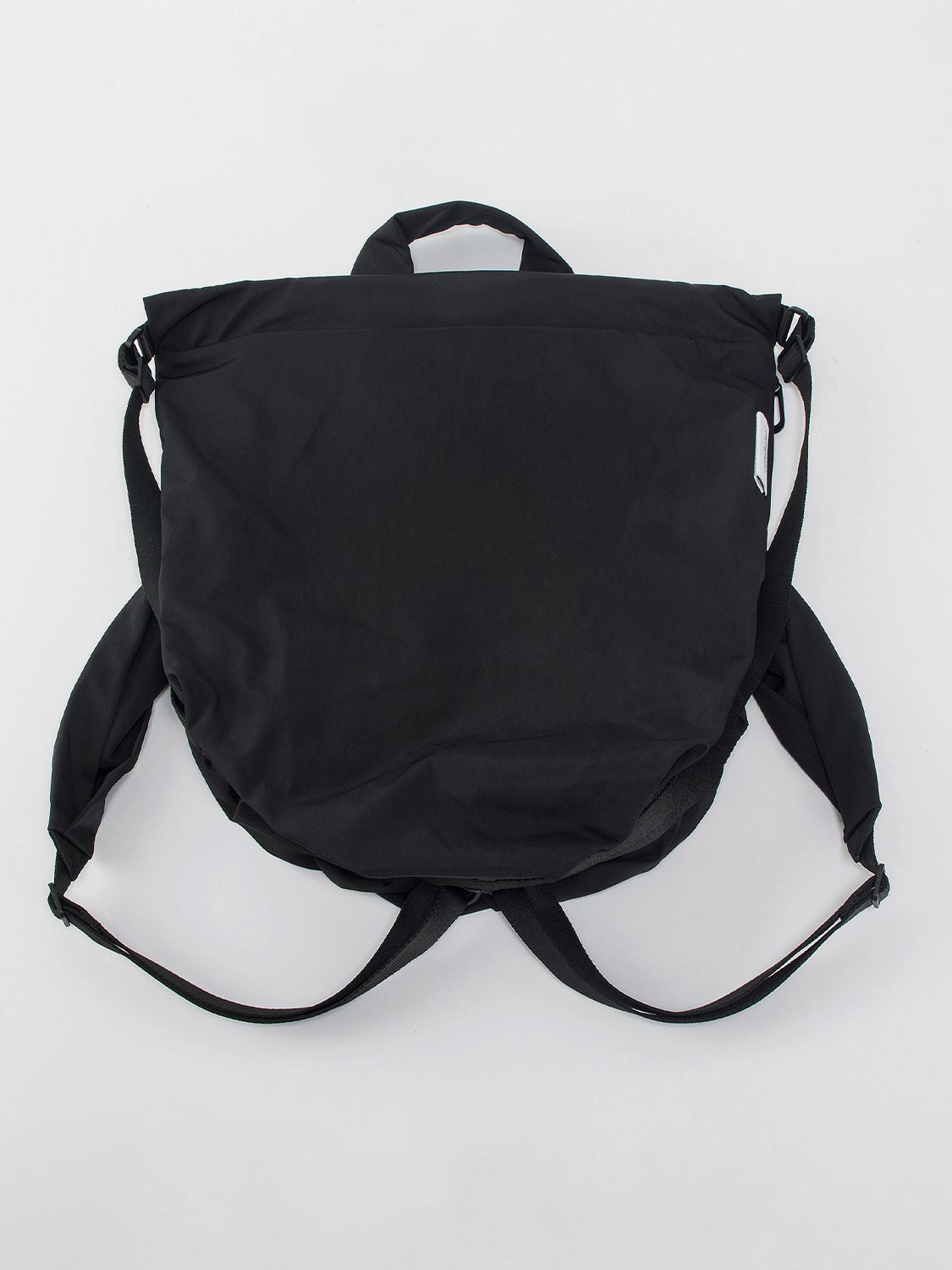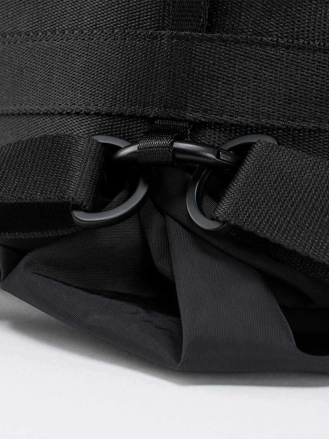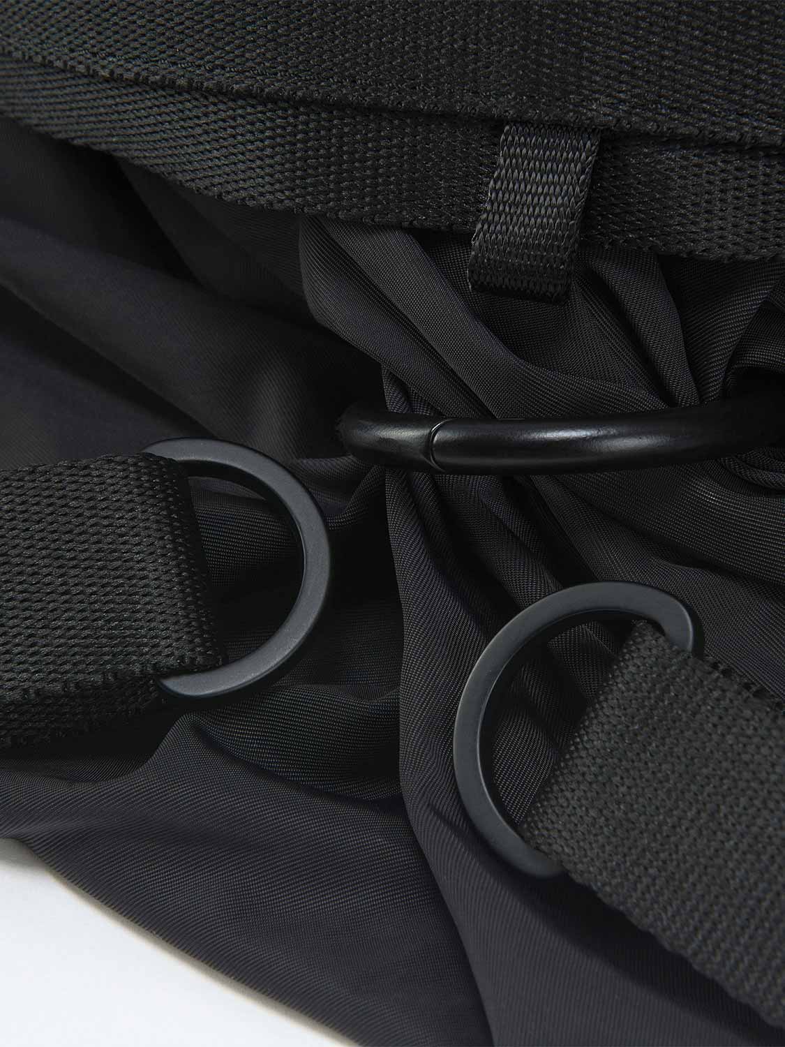 背面のファスナーに手持ち用のハンドルや、ストラップが内臓されており、底面のひねりに付属されたリングにストラップを引っかける事でバックパックとしても使用可能。