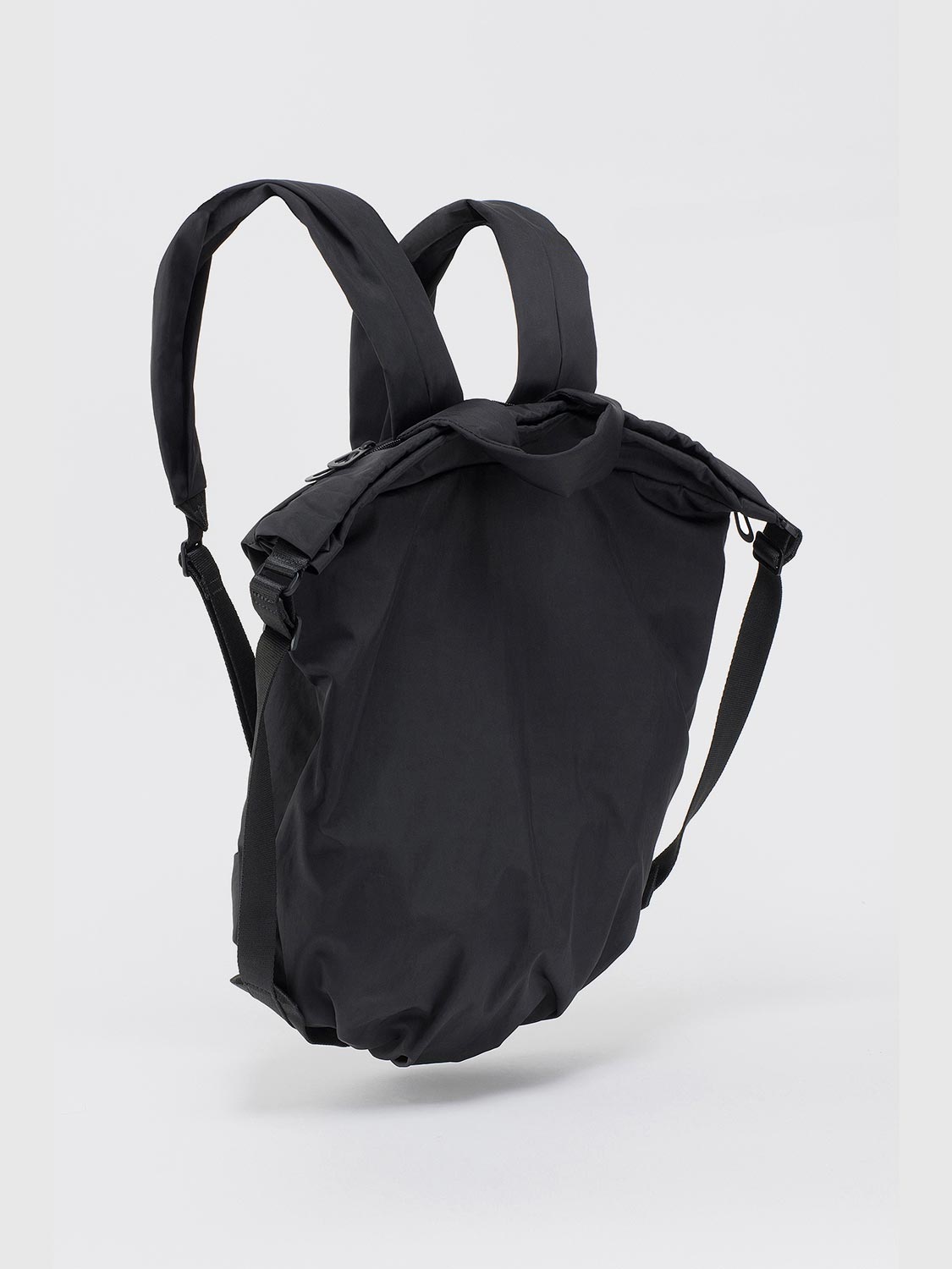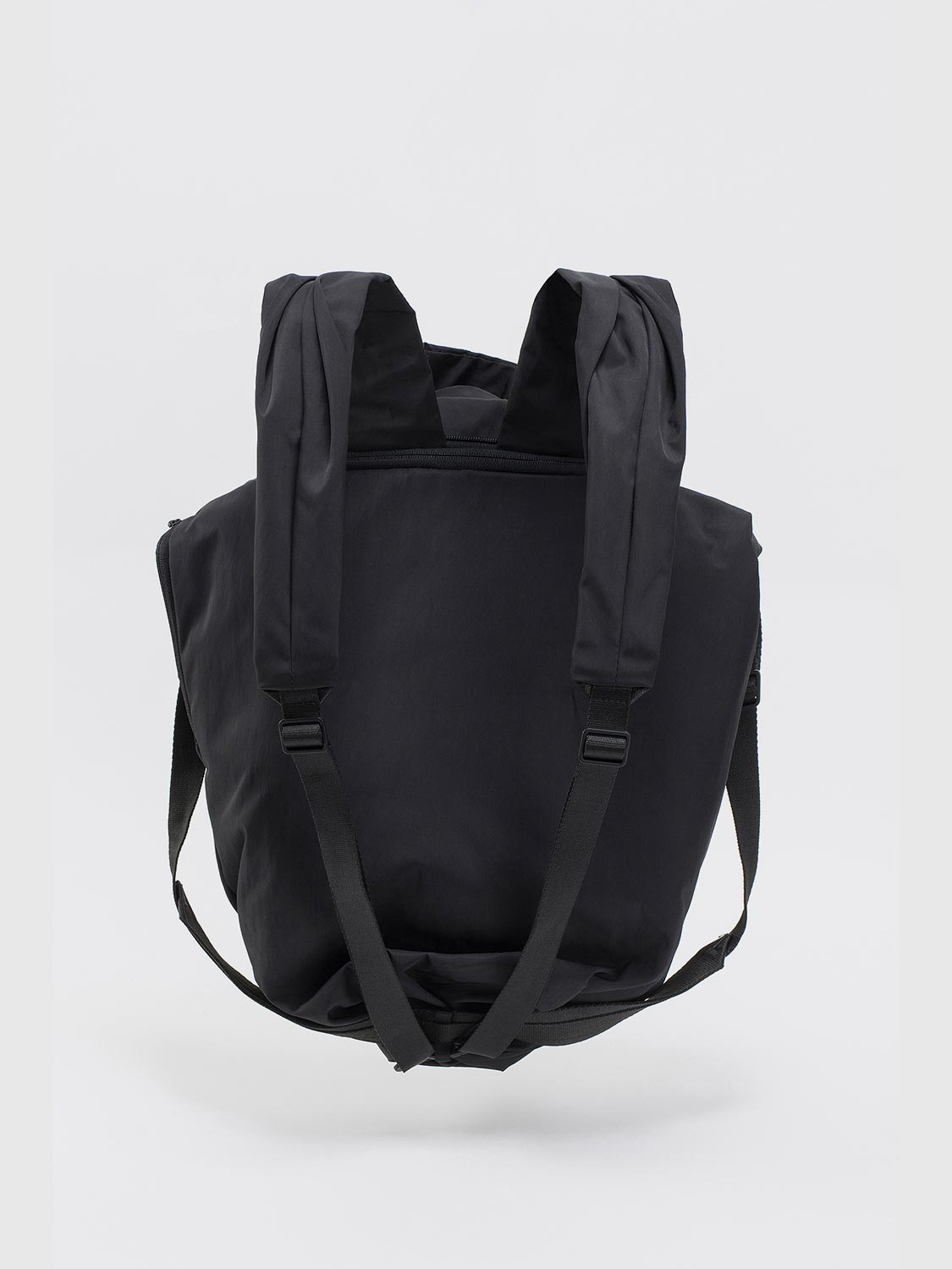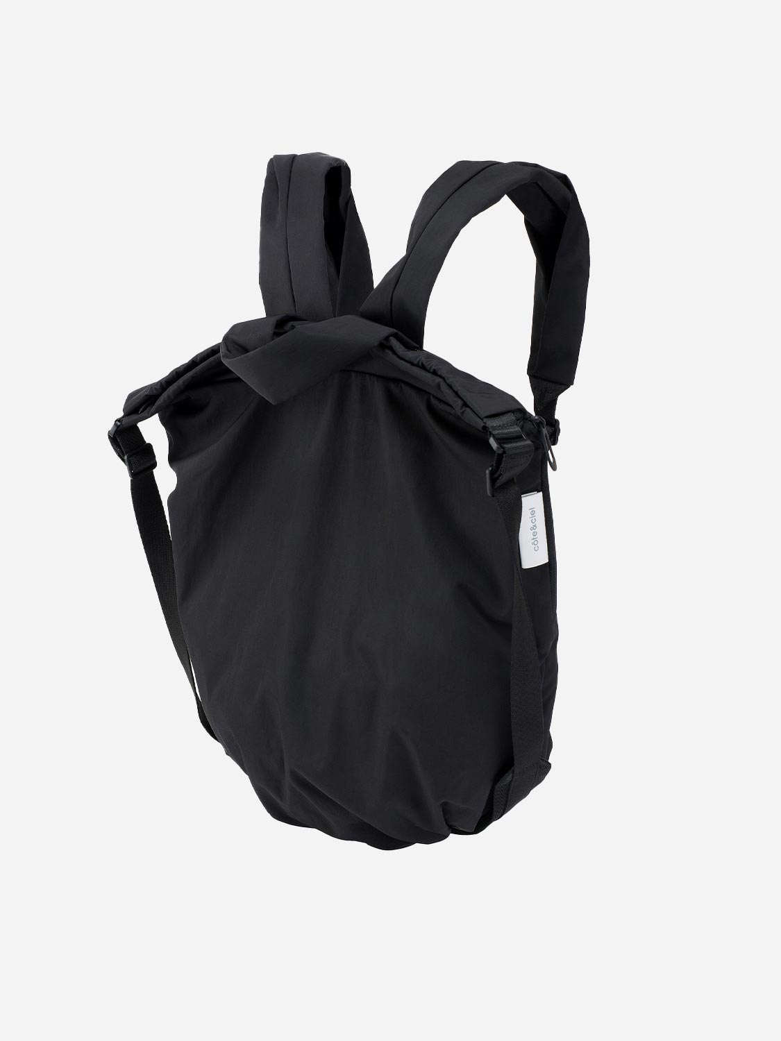 背面のファスナーに手持ち用のハンドルや、ストラップが内臓されており、底面のひねりに付属されたリングにストラップを引っかける事でバックパックとしても使用可能。