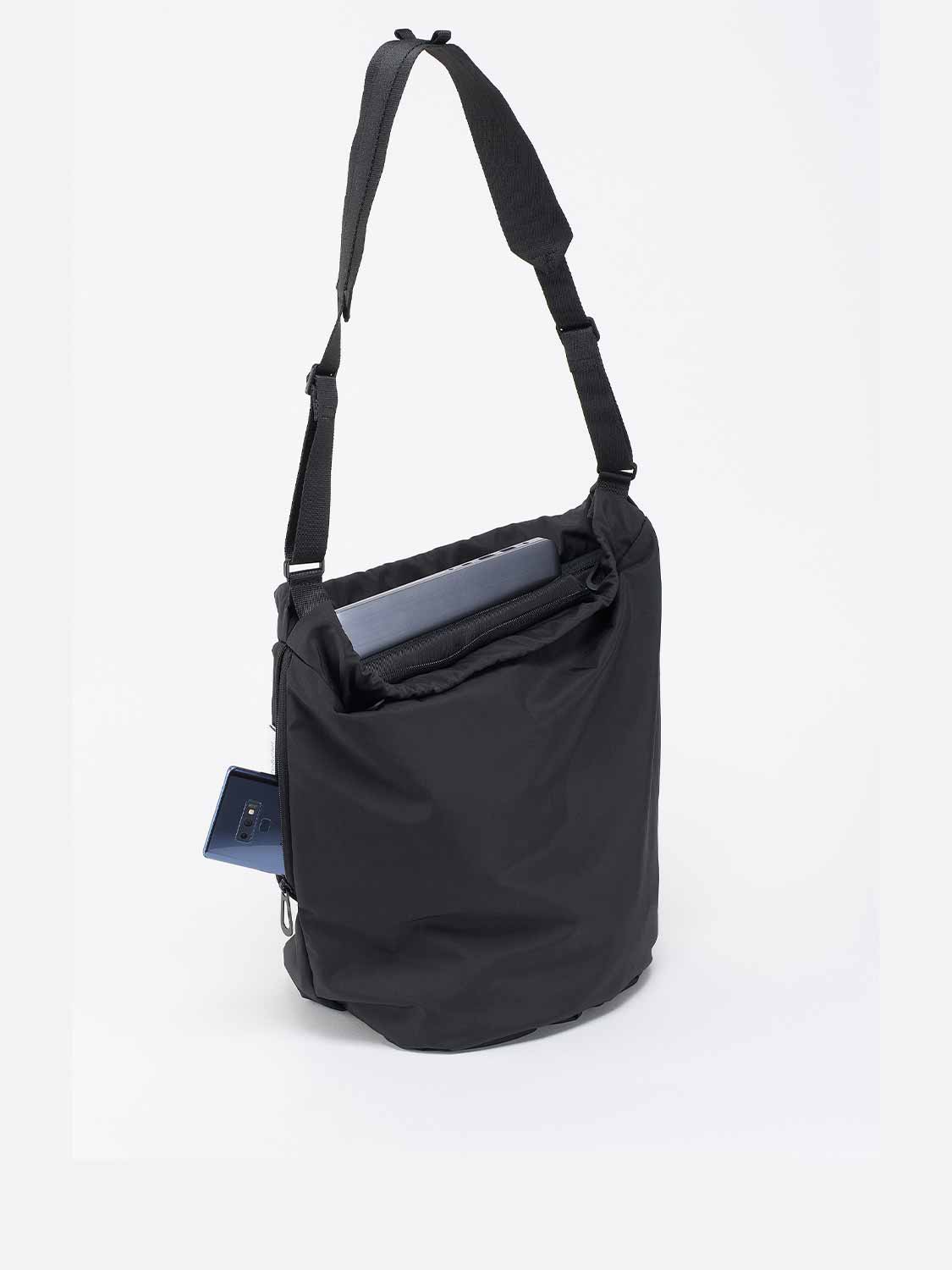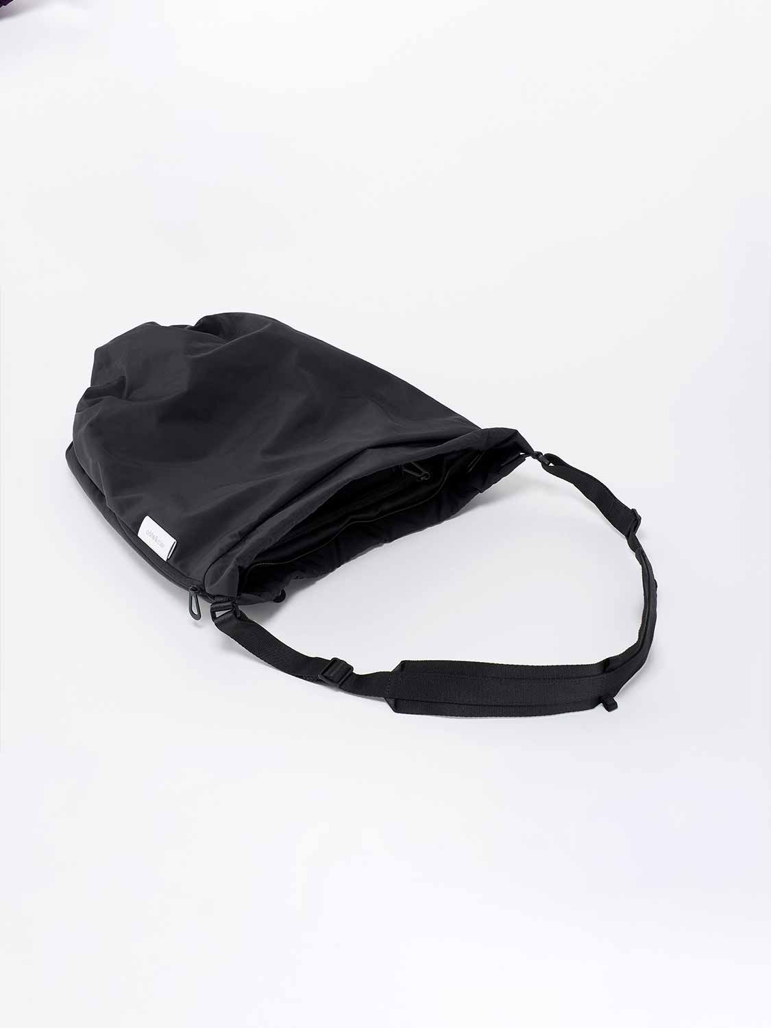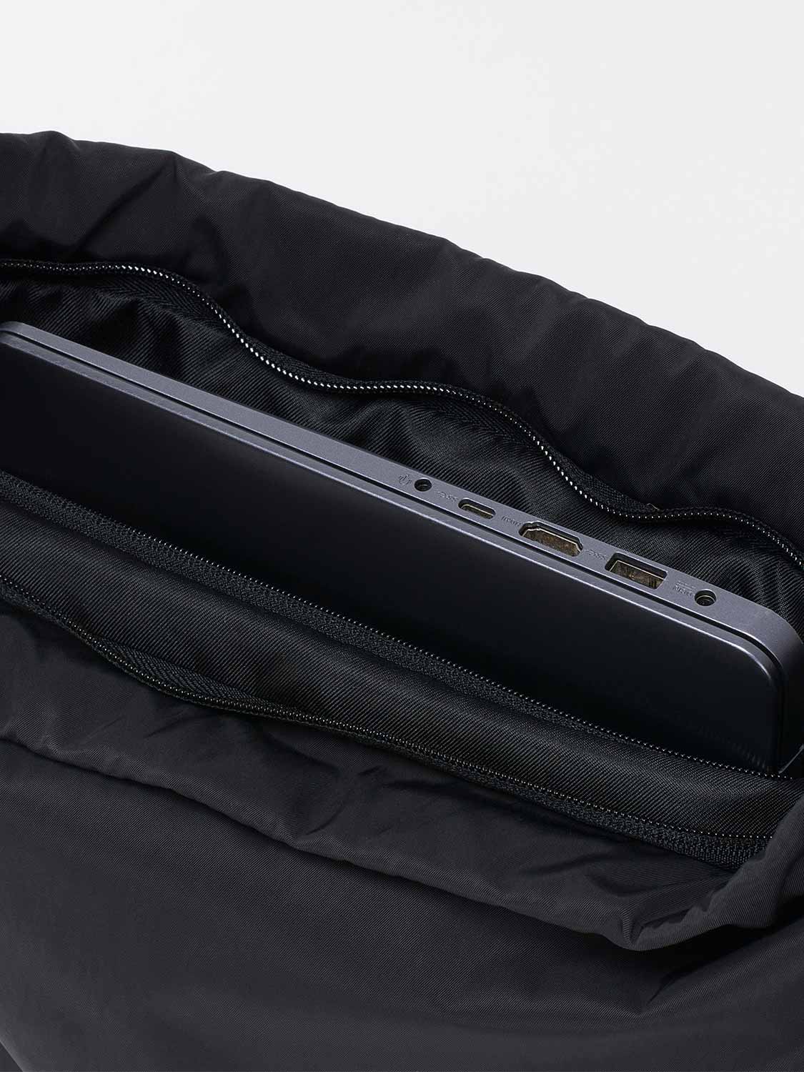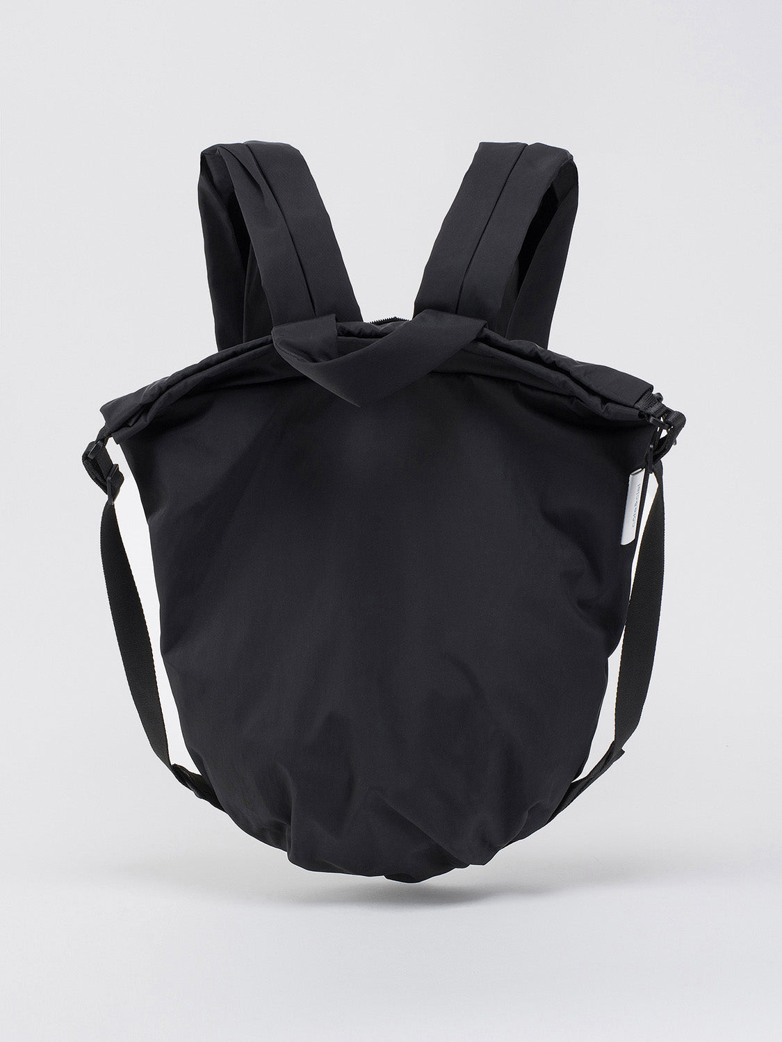 背面のファスナーに手持ち用のハンドルや、ストラップが内臓されており、底面のひねりに付属されたリングにストラップを引っかける事でバックパックとしても使用可能。