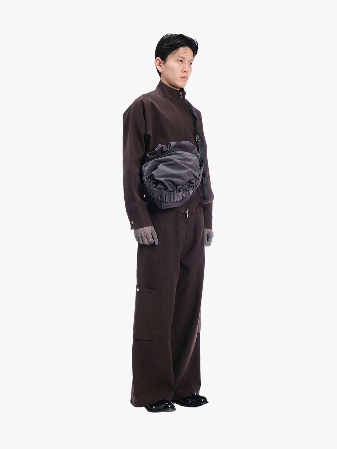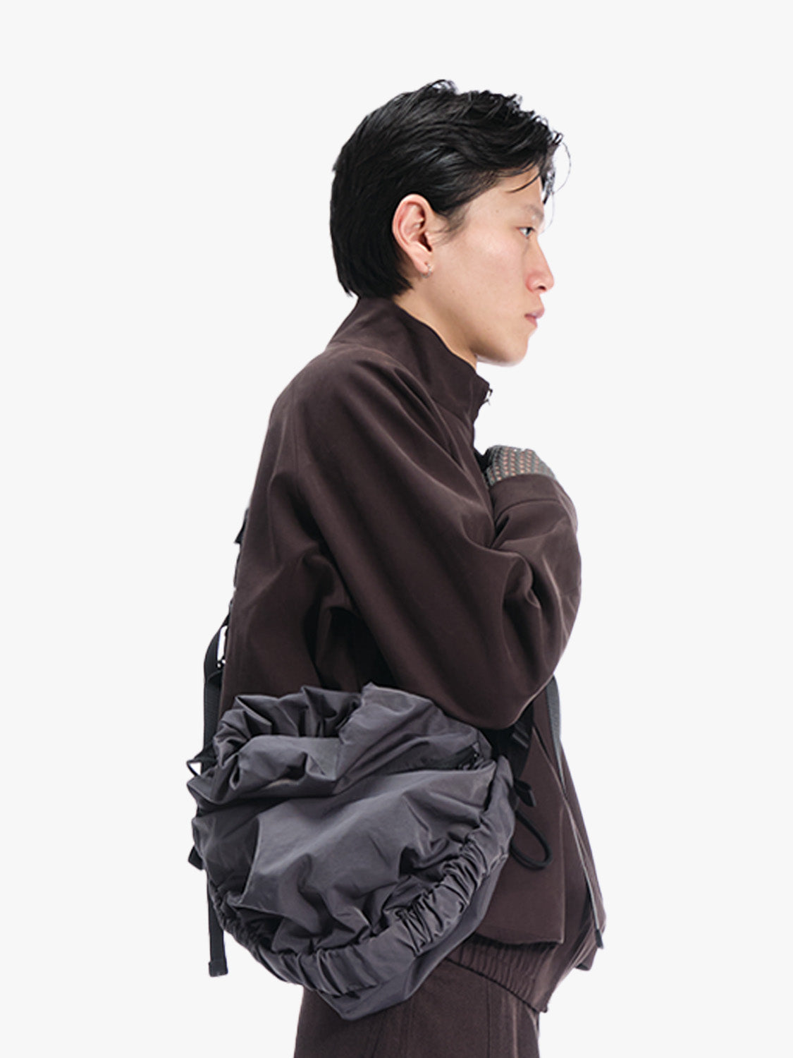 スレートグレーのナイロン素材を使用した、最新のクロスボディバッグ「UVA」は、ギャザーを寄せた調節可能なストラップが特徴で、バッグの容量をユーザーのニーズに合わせて調整できます。