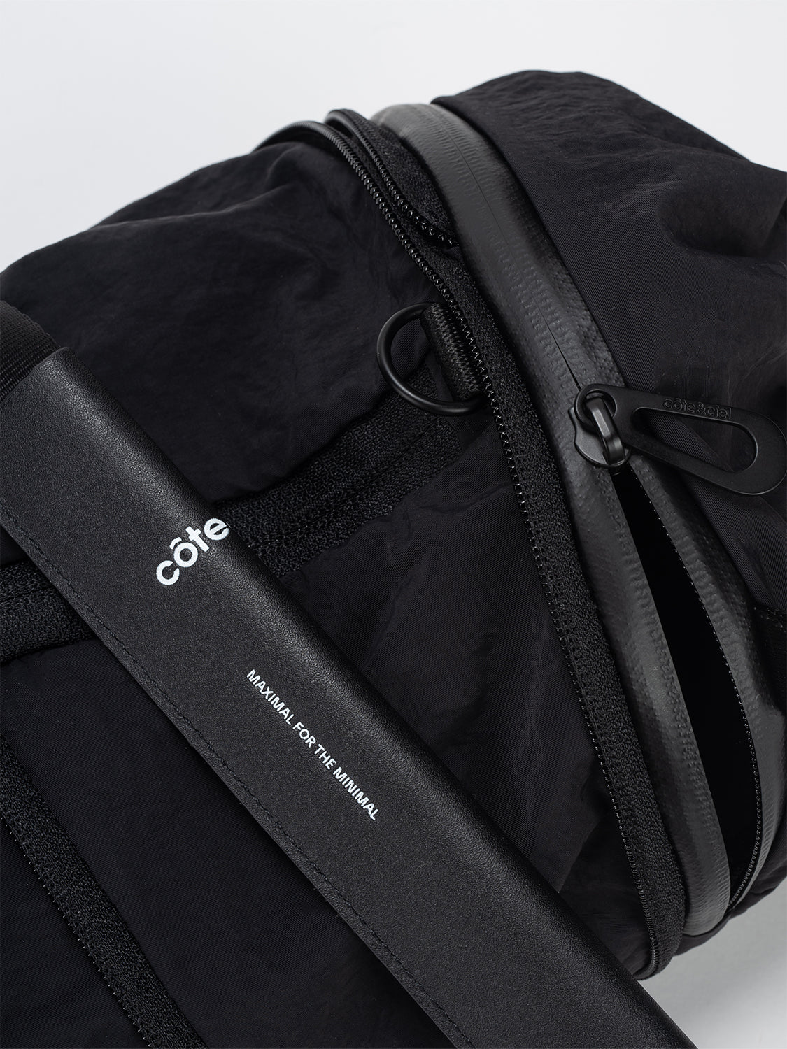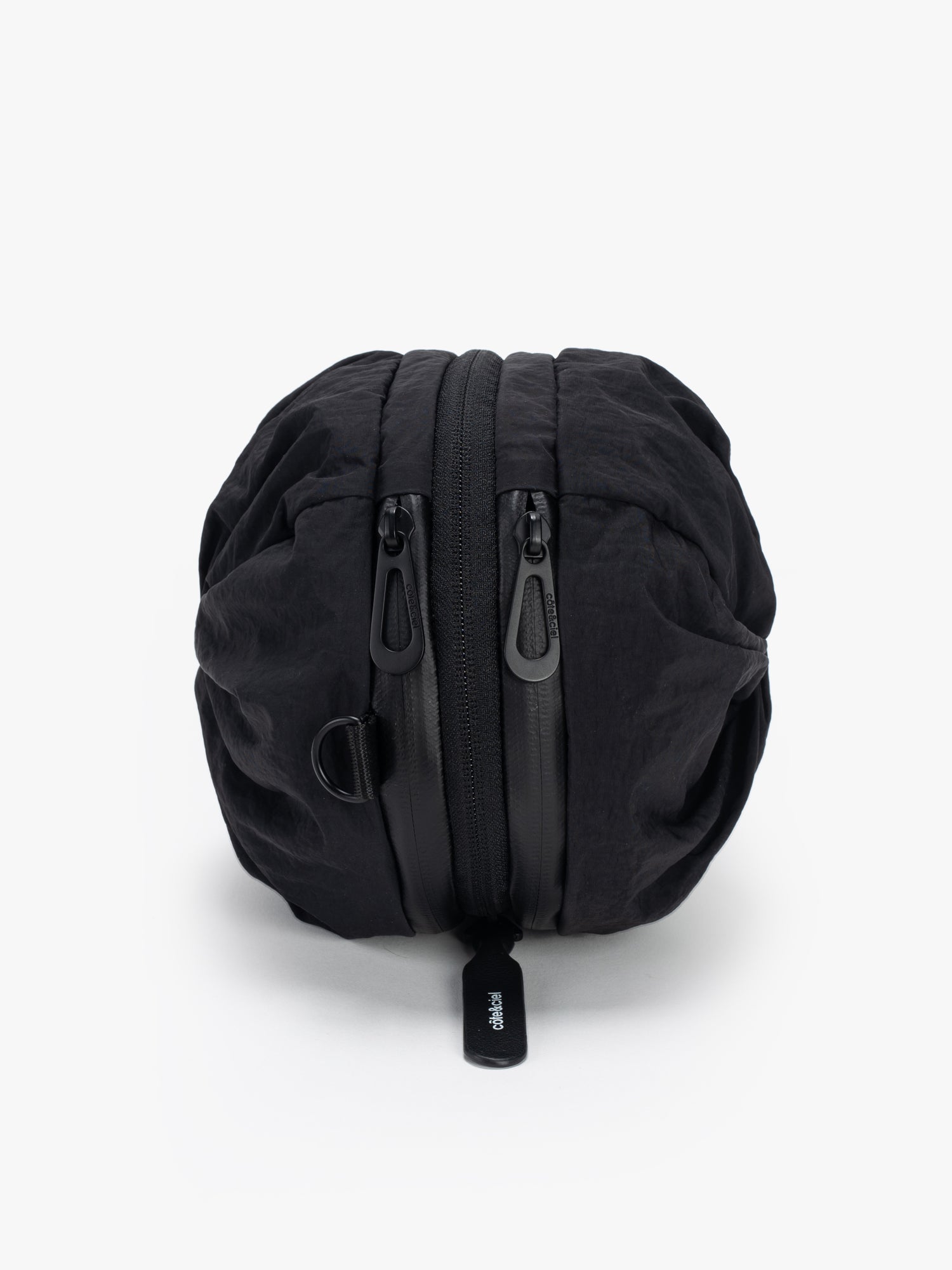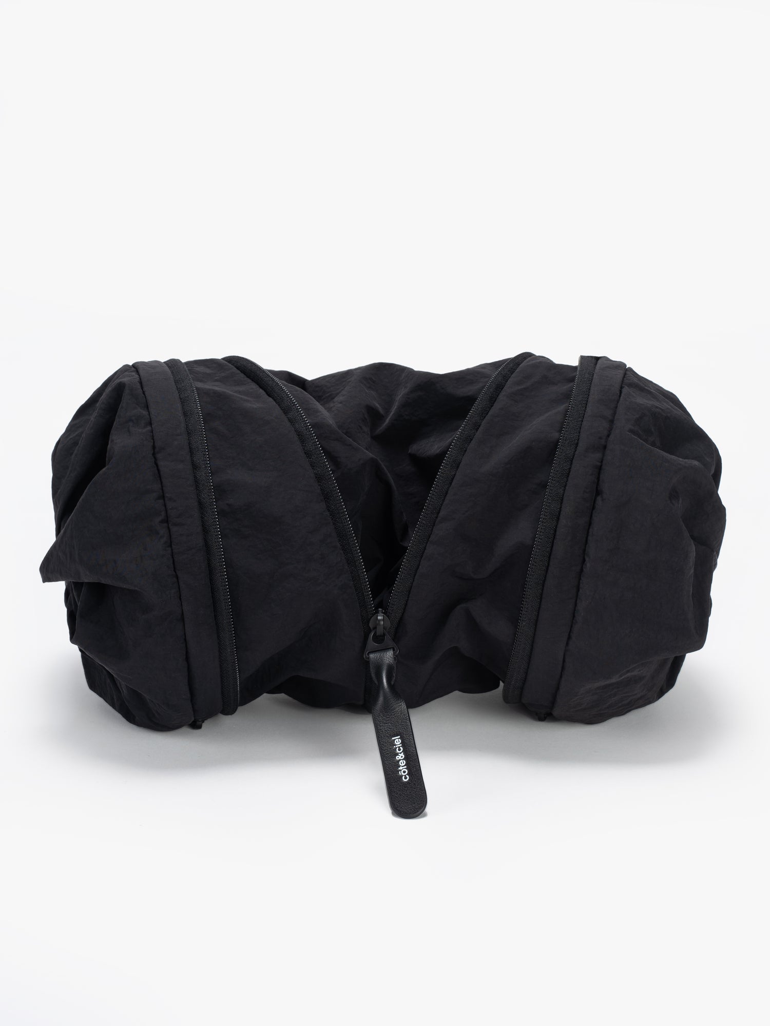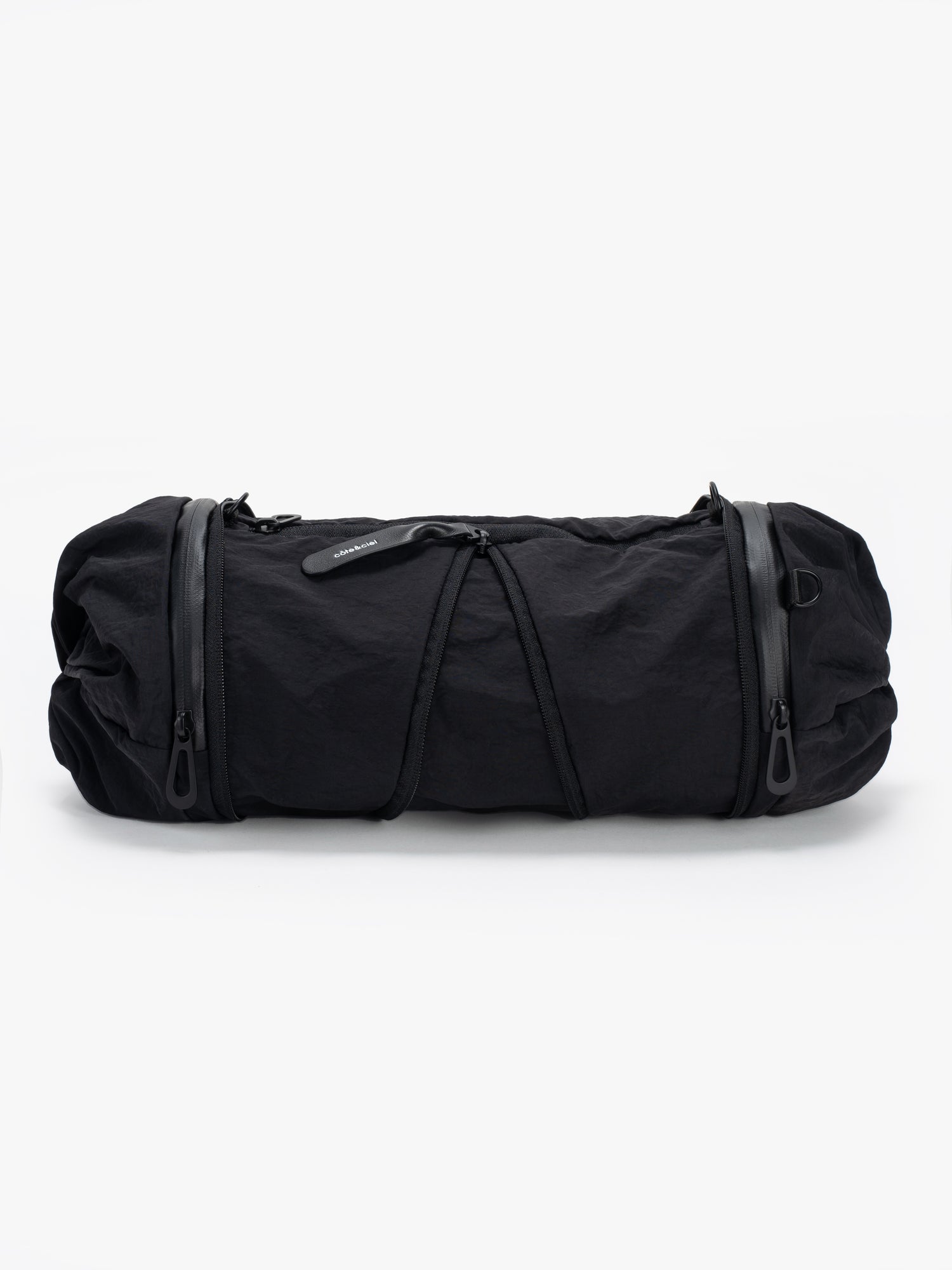 小さいオプションである圧縮 2 ポケット バッグは、ポケットが収納されている両端の生地に独特のひねりが施されているのが特徴です。そして中央のジッパーでバッグを小さなダッフルの形に拡張し、更にその中のジッパーを使用して中央のコンパートメントへアクセスします。