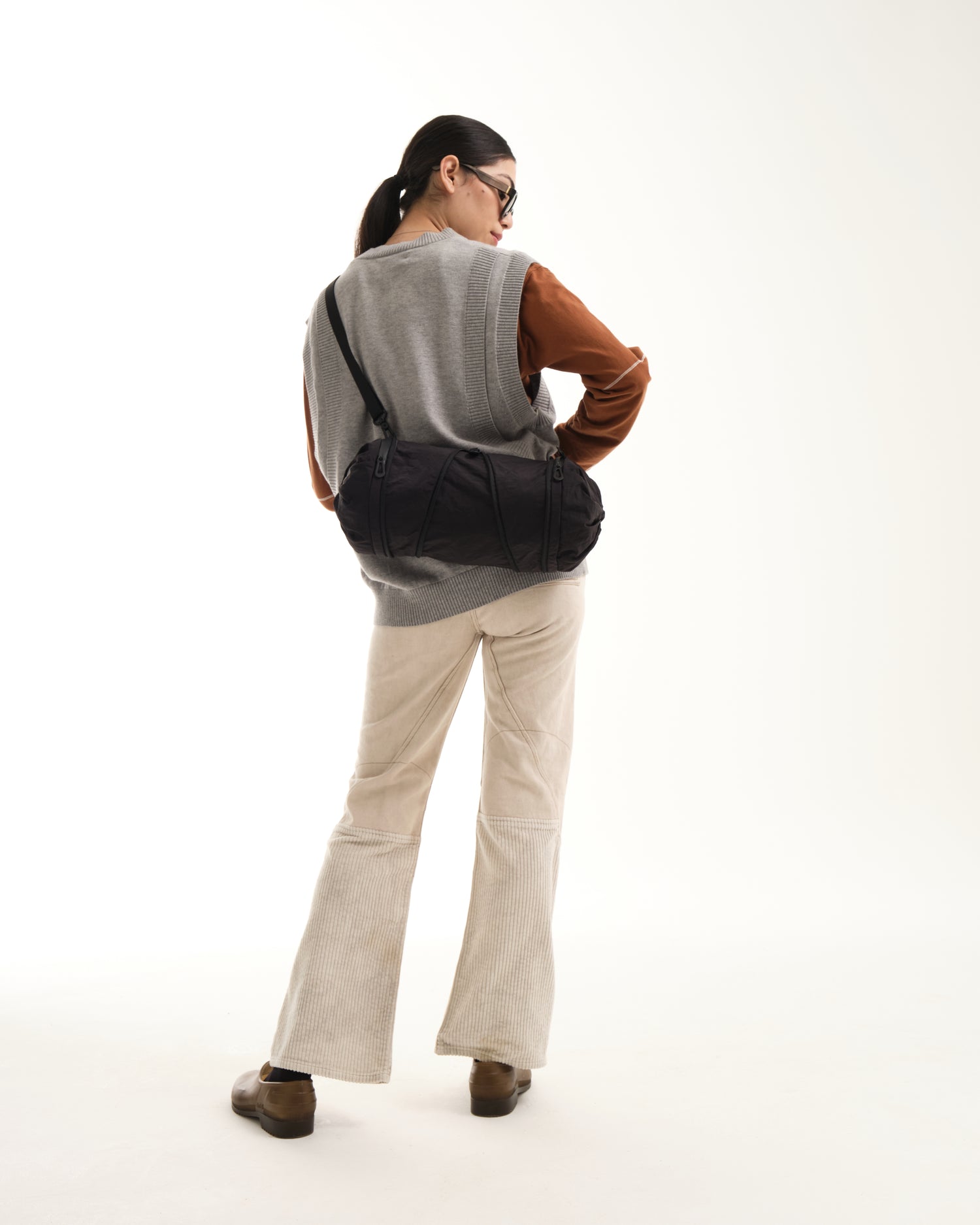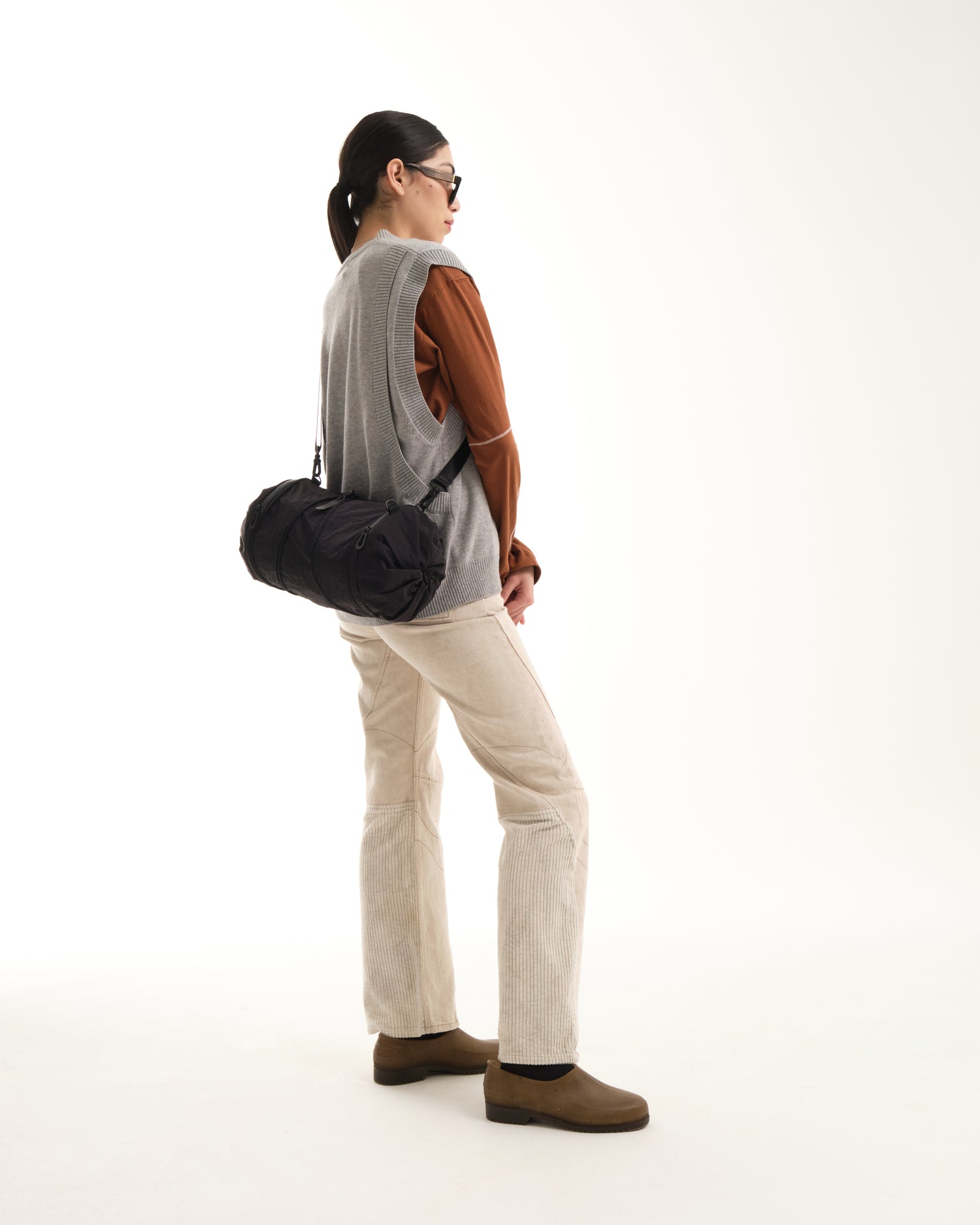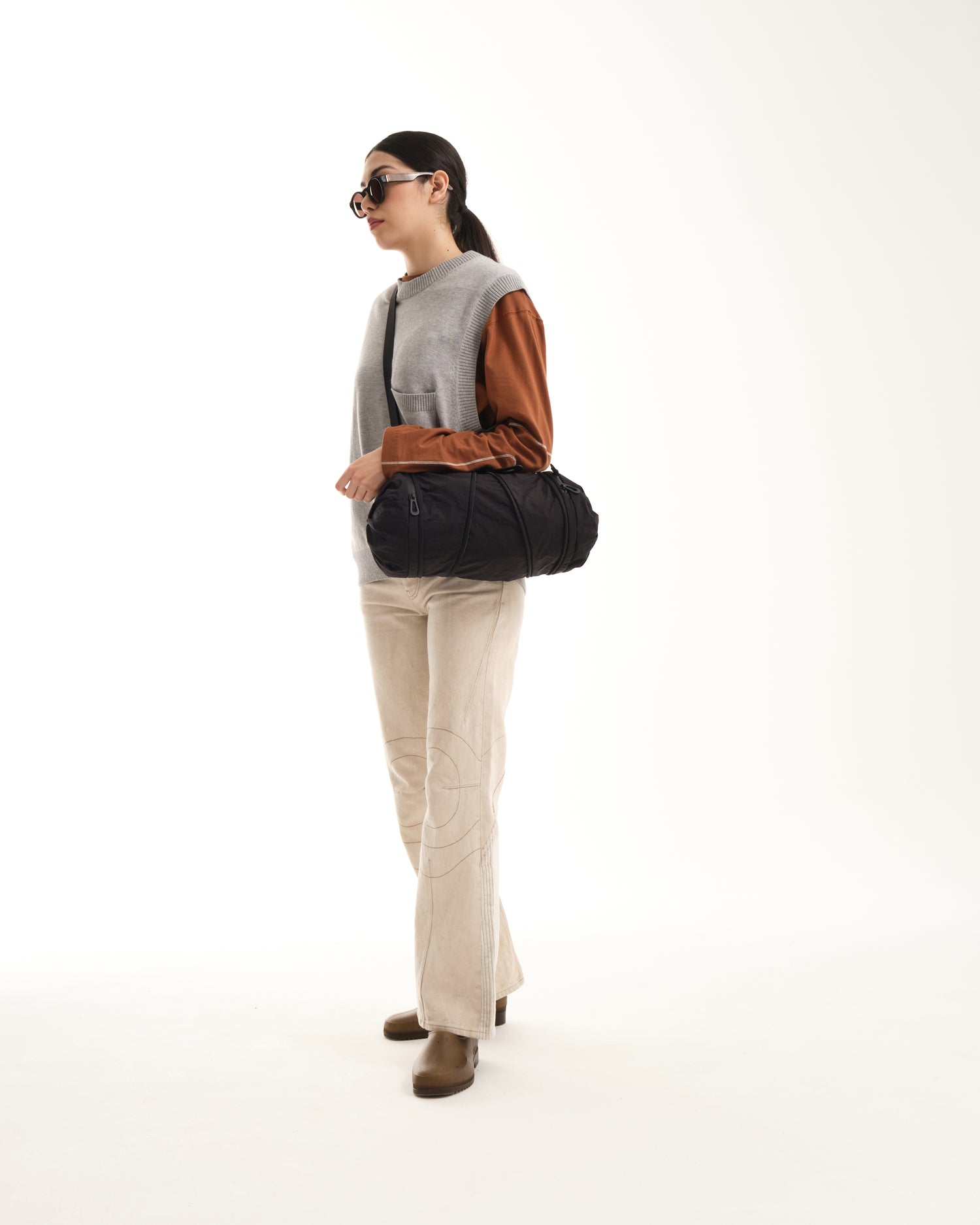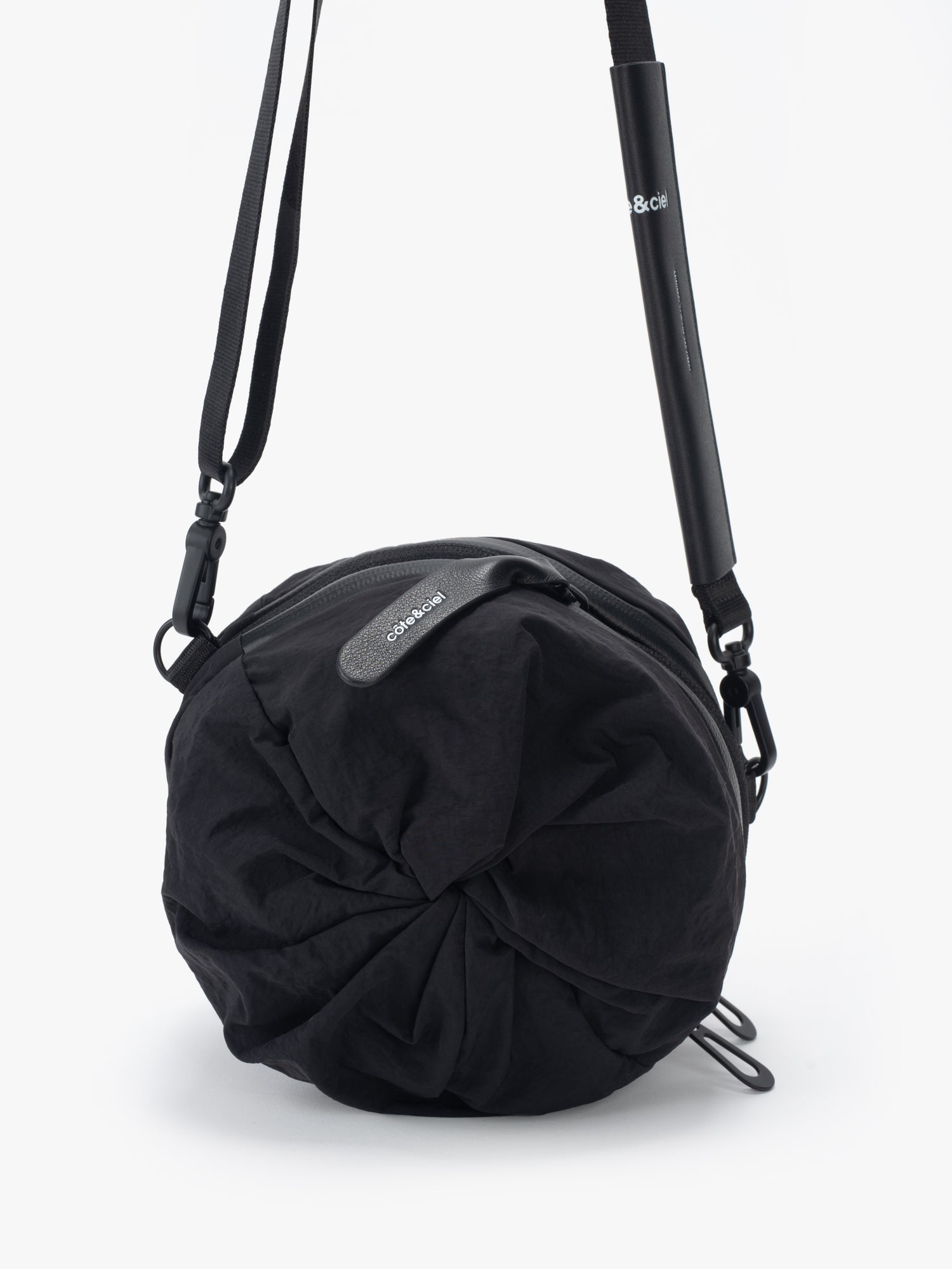 小さいオプションである圧縮 2 ポケット バッグは、ポケットが収納されている両端の生地に独特のひねりが施されているのが特徴です。そして中央のジッパーでバッグを小さなダッフルの形に拡張し、更にその中のジッパーを使用して中央のコンパートメントへアクセスします。