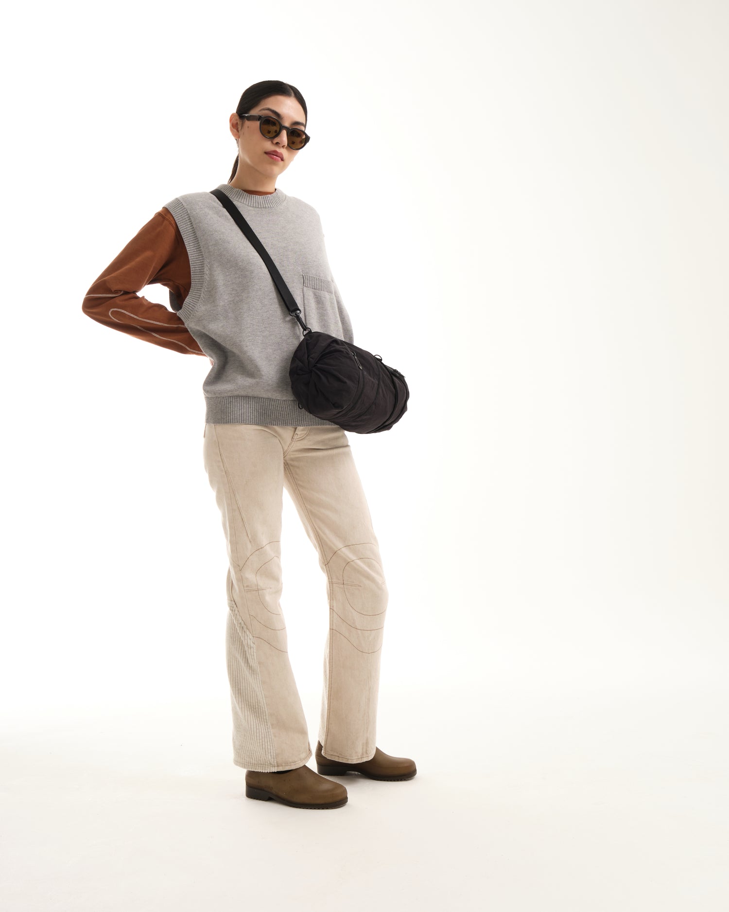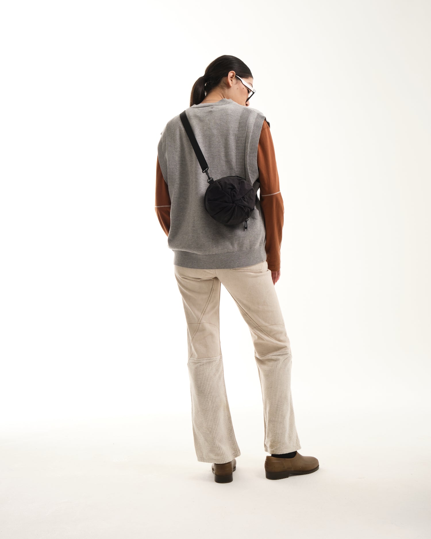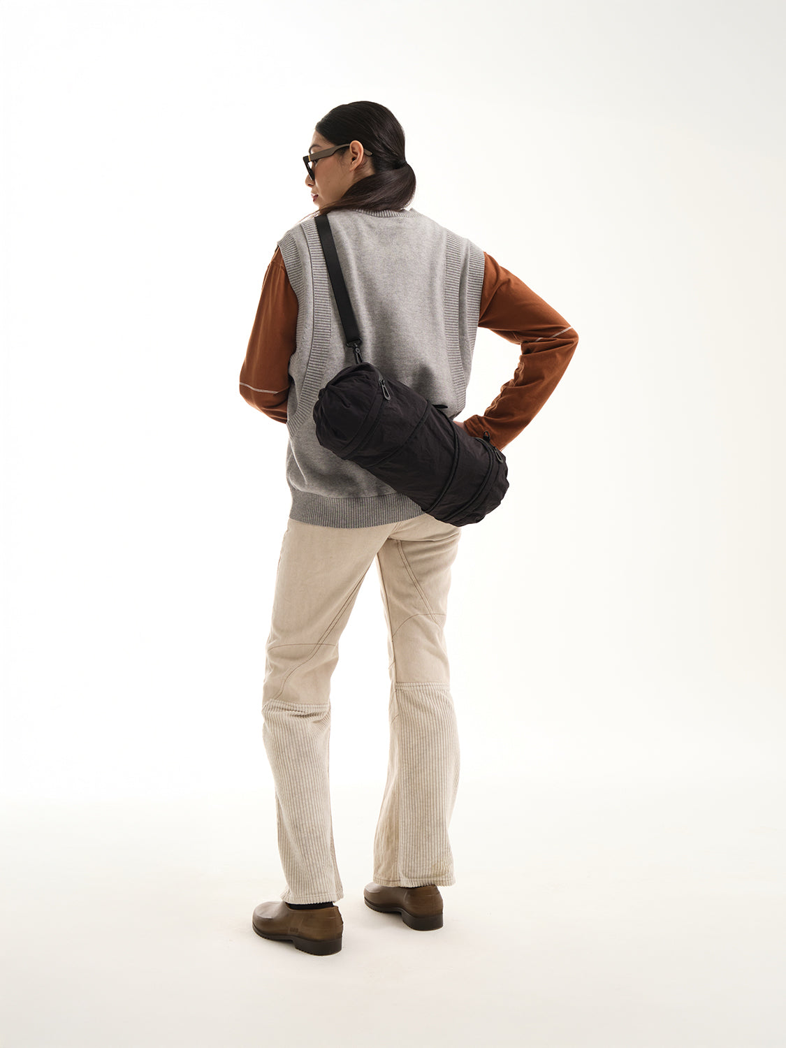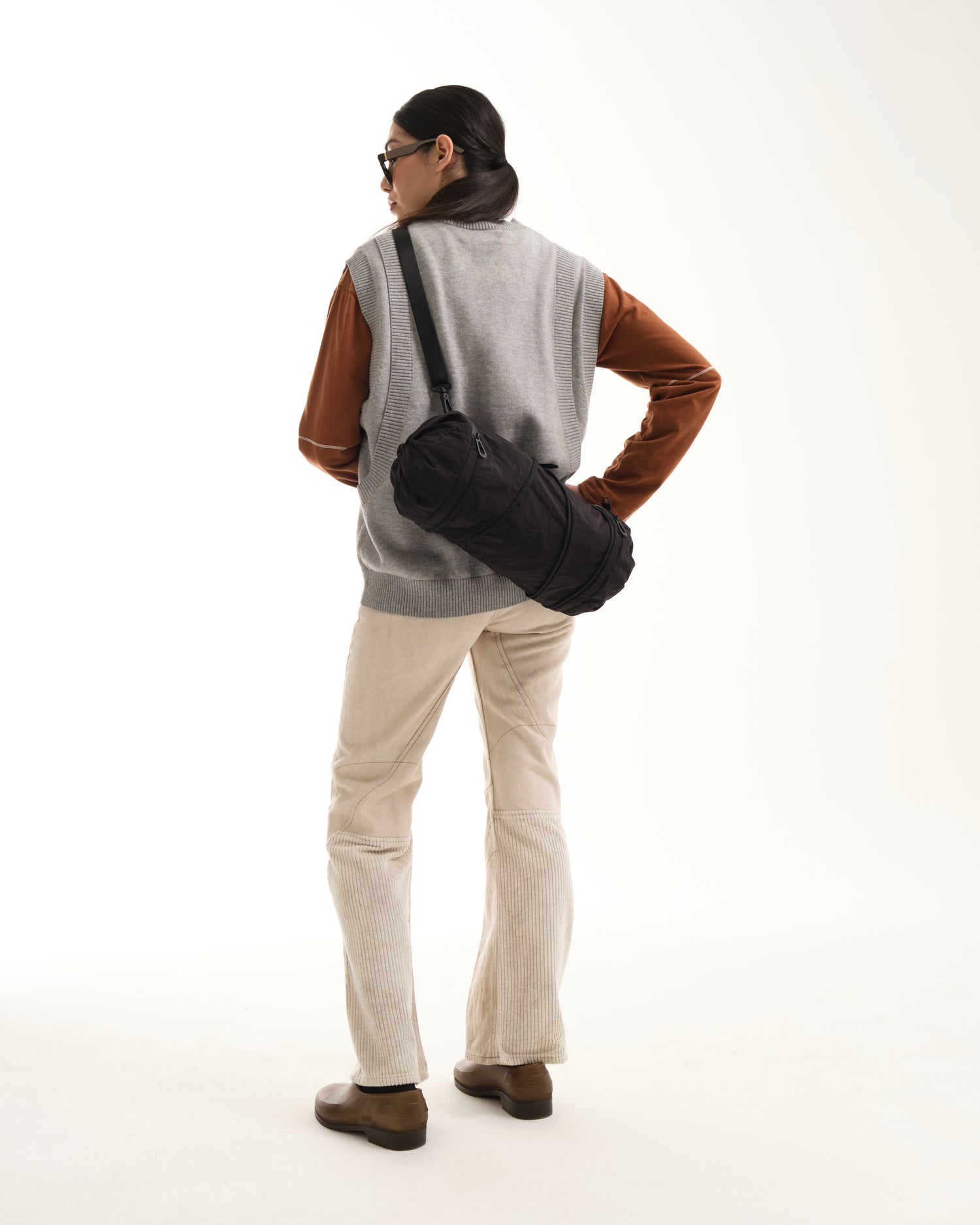 小さいオプションである圧縮 2 ポケット バッグは、ポケットが収納されている両端の生地に独特のひねりが施されているのが特徴です。そして中央のジッパーでバッグを小さなダッフルの形に拡張し、更にその中のジッパーを使用して中央のコンパートメントへアクセスします。