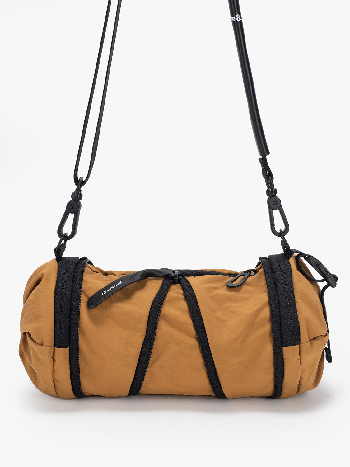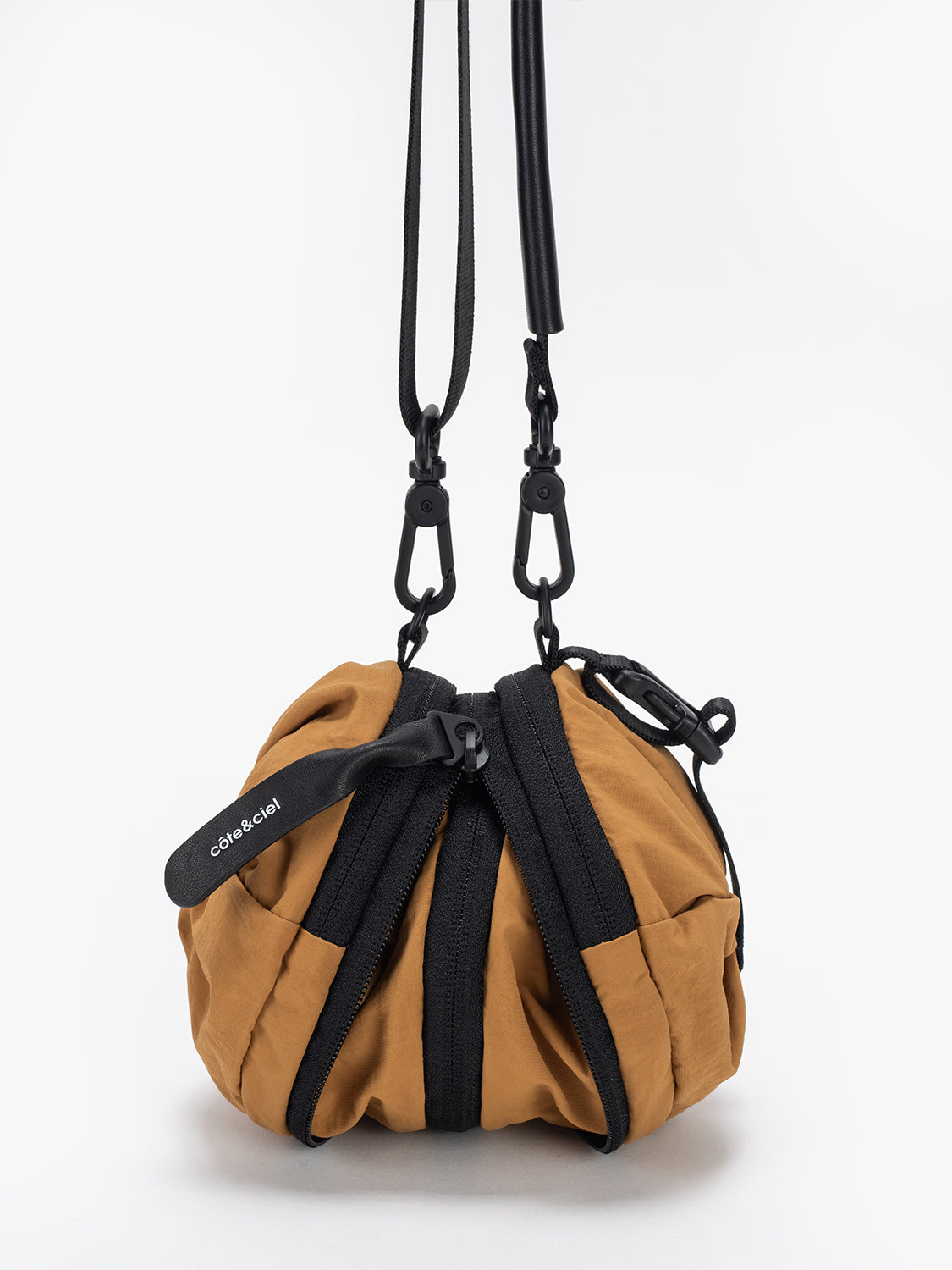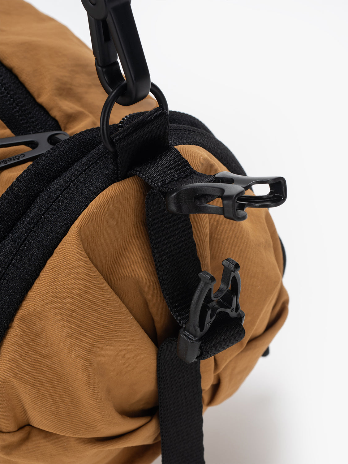小さいオプションである圧縮 2 ポケット バッグは、ポケットが収納されている両端の生地に独特のひねりが施されているのが特徴です。そして中央のジッパーでバッグを小さなダッフルの形に拡張し、更にその中のジッパーを使用して中央のコンパートメントへアクセスします。