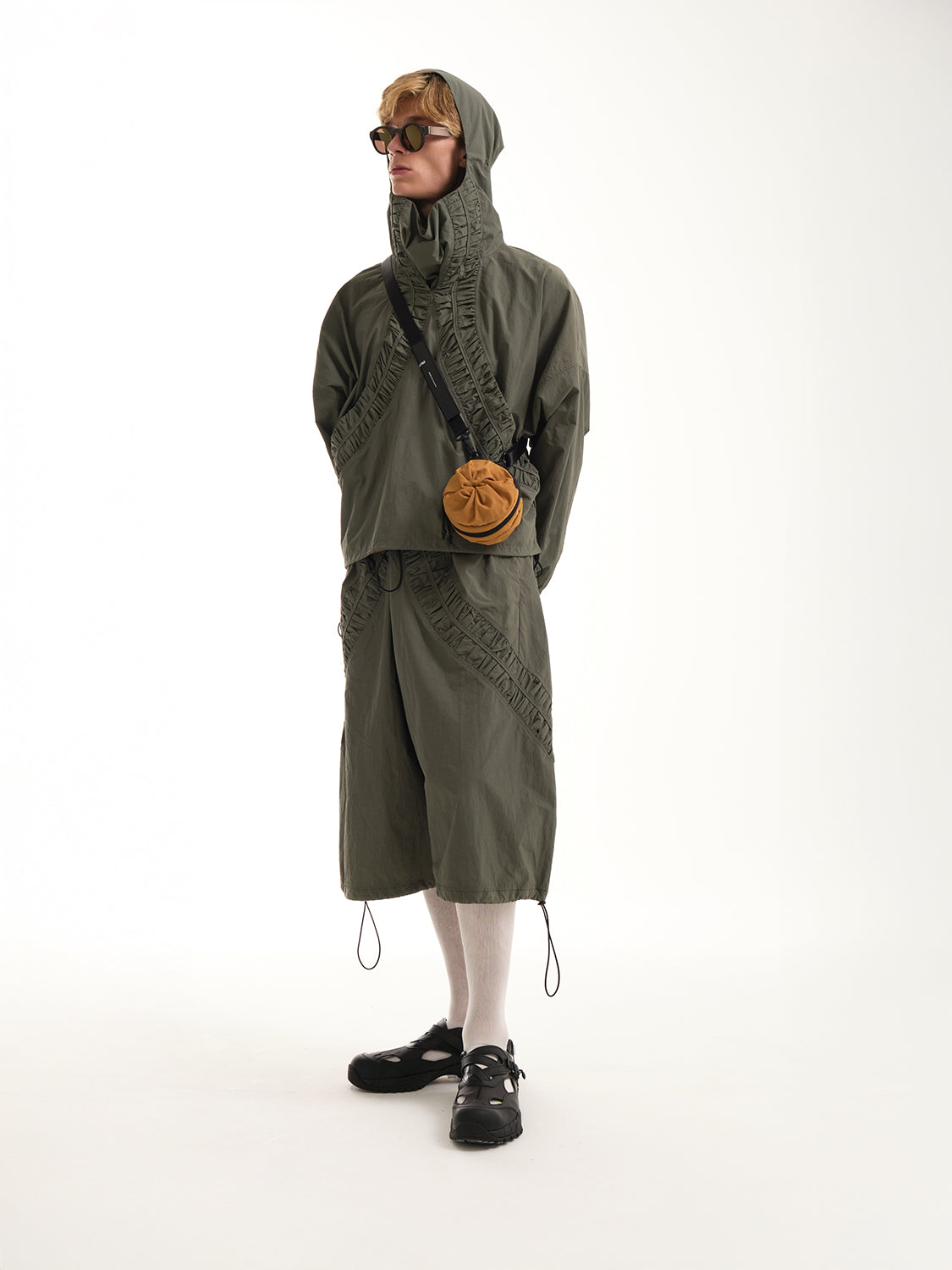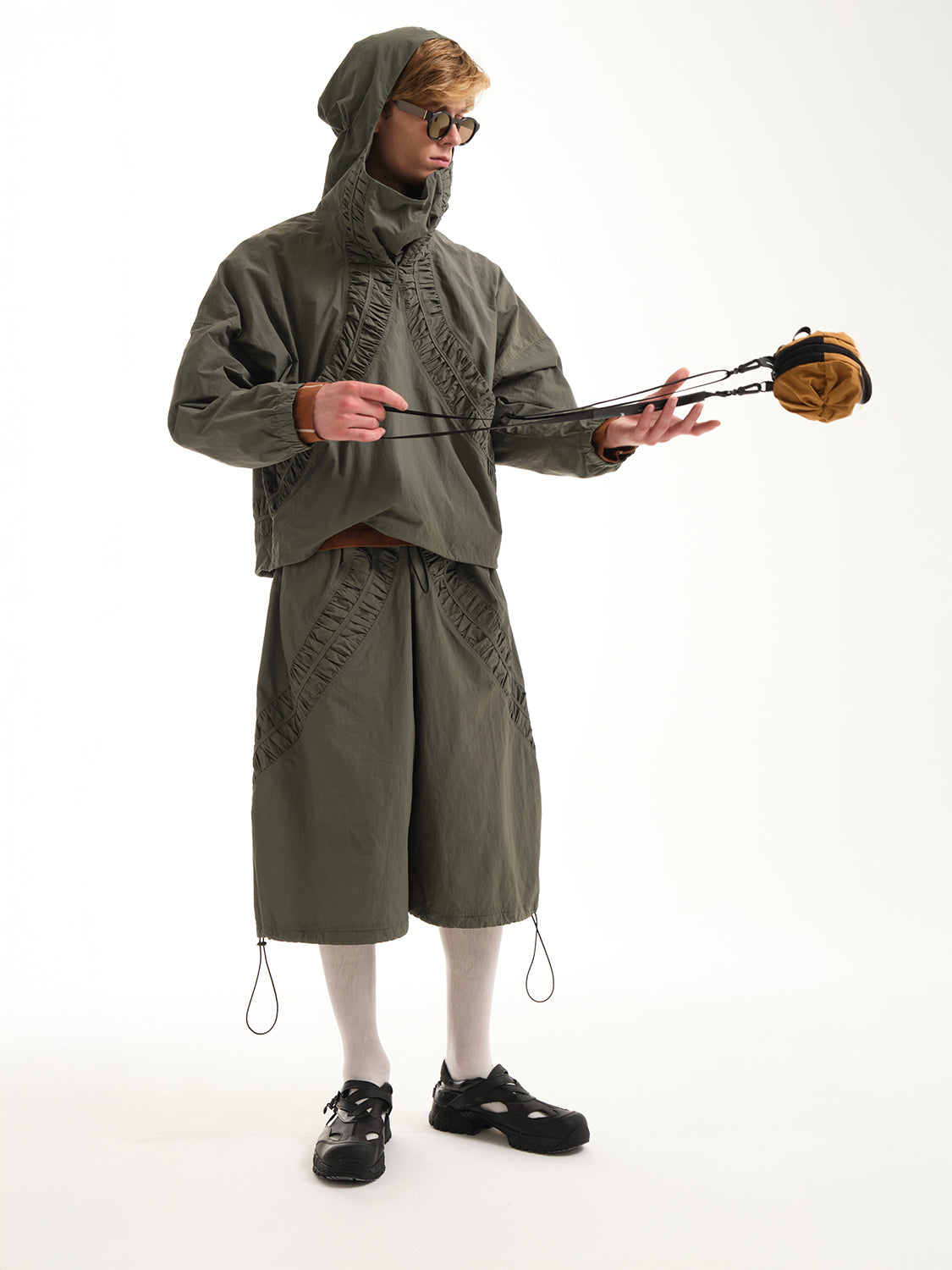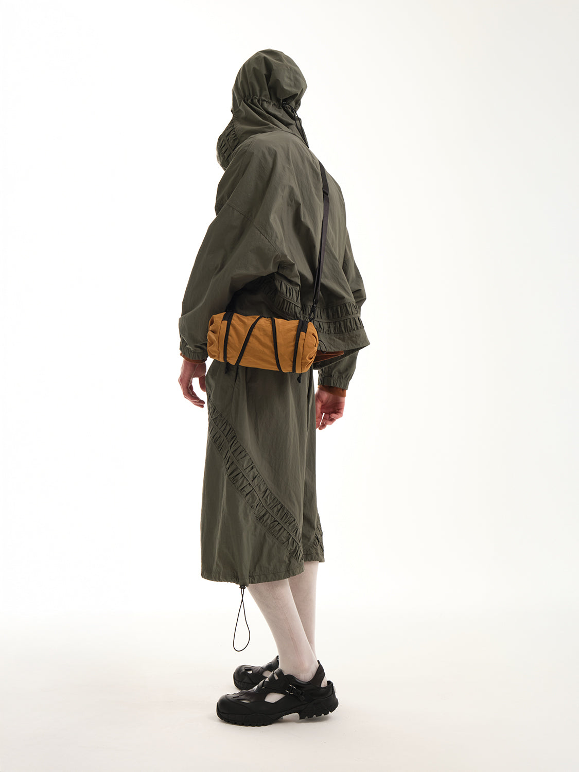小さいオプションである圧縮 2 ポケット バッグは、ポケットが収納されている両端の生地に独特のひねりが施されているのが特徴です。そして中央のジッパーでバッグを小さなダッフルの形に拡張し、更にその中のジッパーを使用して中央のコンパートメントへアクセスします。