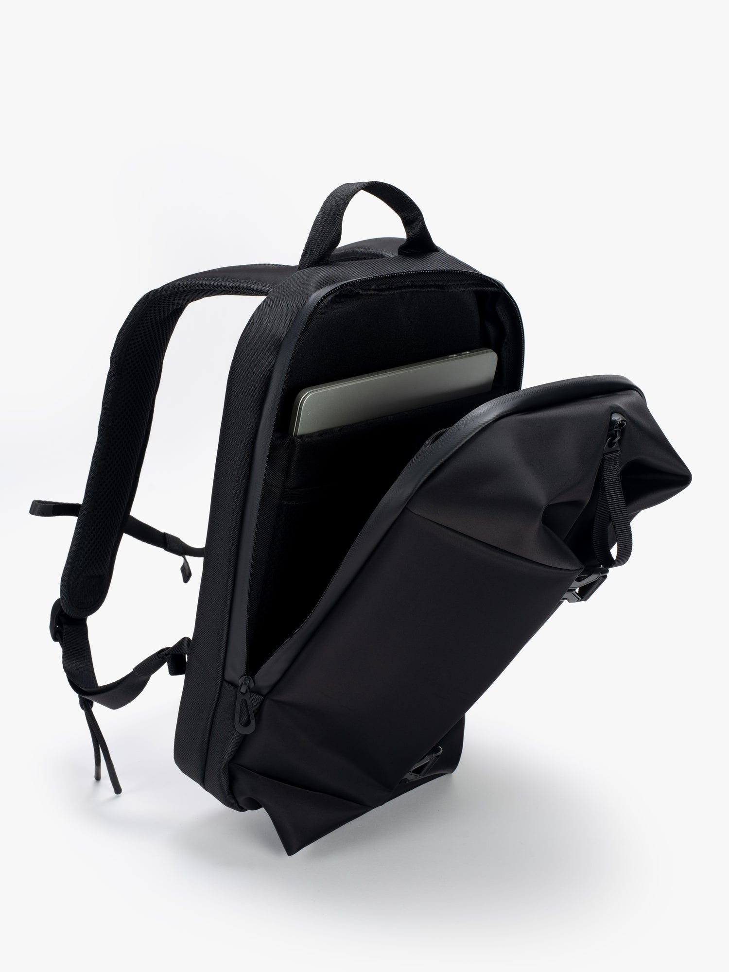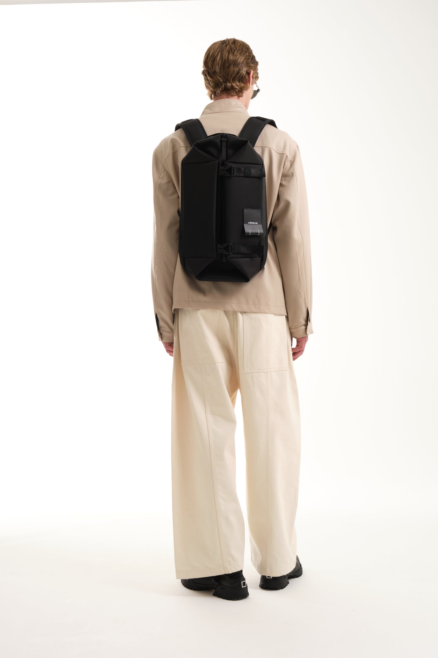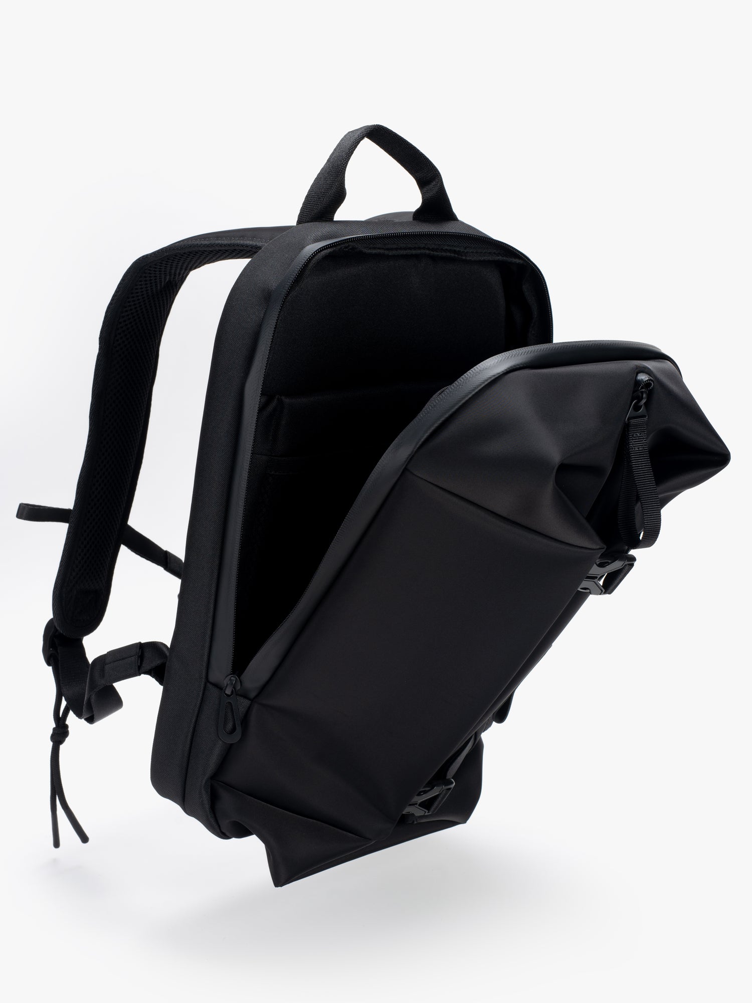 YUKON が、当社の象徴的な洗練されたブラック素材で帰ってきました。驚くべき機能を備えたコンパクトなバックパック。フロントの 2 つのバックルを開くと、キュービック状の前面コンパートメントが最大容量まで拡張されます。